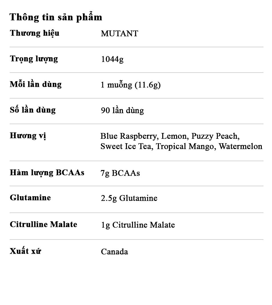 LỢI ÍCH VƯỢT TRỘIBổ sung 7g BCAA đạt tiêu chuẩn caoMỗi lần sử dụng Mutant BCAA tương đương 7g axit amin được nạp vào cơ thể. BCAA sử dụng 3 loại leucine, isoleucine và valine có tác dụng khác nhau và cùng nhau thúc đẩy cơ bắp tái tạo và hỗ trợ phát triển: