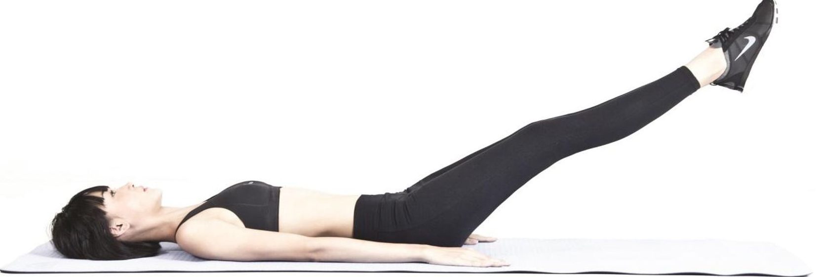 Bài tập này giúp bạn tăng cường sức mạnh ở cơ lưng và bụng, đầu tiên nằm ngửa trên thảm tập, chân duỗi thẳng, sau đó từ từ nhấc chân, giữ thẳng và cách mặt đất khoảng 30cm. Nếu gặp khó khăn, lúc bắt đầu bạn có thể nhấc một chân lên trước, sau đó đổi bên để dễ dàng thực hiện hơn.