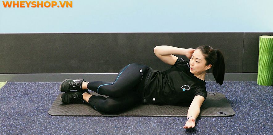 - Từ từ co chân lên 90 độ, nghiêng sang một bên và giữ chân không chạm đất, đồng thời nâng ngực và vai hướng về cùng phía gối đang co.