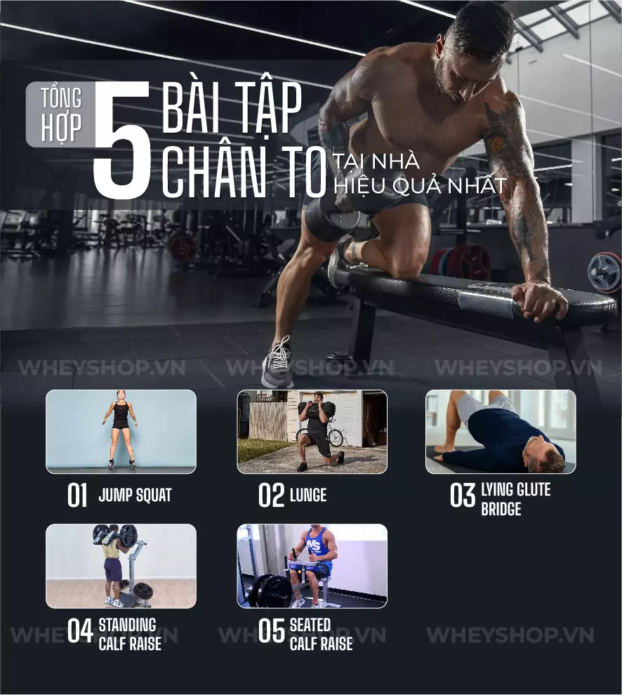 Cơ chân là nhóm cơ lớn nhất và quan trọng nhất với cơ thể, đảm nhiệm nhiều vai trò quan trọng. Tập cơ chân là điều bắt buộc với người tập gym, thể hình mong muốn cơ thể khỏe mạnh, cân đối. Bài viết này, WheyShop sẽ giới thiệu tới bạn 5 bài tập chân to tại nhà đơn giản nhưng hiệu quả cao, giúp bạn dễ dàng sở hữu cơ chân săn chắc, khỏe mạnh. Cùng tìm hiểu ngay nhé !