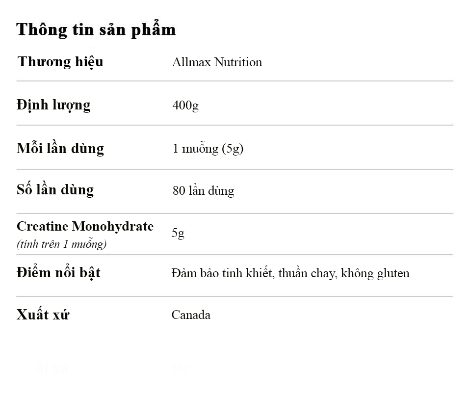 Allmax Creatine cung cấp nguồn Creatine Monohydrate tinh khiết 100%, được sản xuất bởi thương hiệu Allmax Nutrition – một trong những hãng thực phẩm bổ sung thể hình hàng đầu của Canada. Sản phẩm nổi bật nhờ sử dụng Creatine Monohydrate dạng Micronized siêu mịn, giúp tăng khả năng hấp thu vào cơ bắp nhanh hơn, hạn chế tình trạng đầy bụng hay khó tiêu thường gặp ở các loại creatine thông thường. Allmax Creatine giúp tăng sức mạnh, cải thiện hiệu suất tập luyện, thúc đẩy phát triển khối cơ nạc và rút ngắn thời gian phục hồi sau buổi tập. Mỗi khẩu phần cung cấp 5g Creatine tinh khiết, không pha tạp, không hương liệu, không chất độn – phù hợp cho cả gymer, vận động viên chuyên nghiệp lẫn người mới bắt đầu tập luyện. Allmax Isoflex đã đạt được nhiều chứng nhận quốc tế: