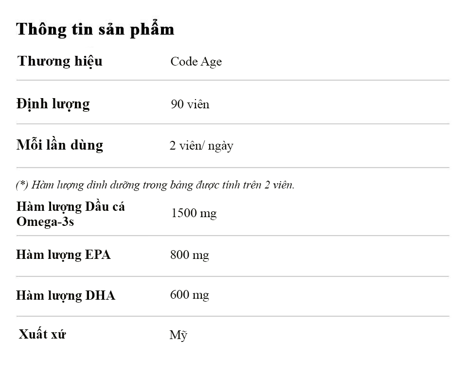 Code Age Amen Omega-3 là sản phẩm bổ sung omega-3 chất lượng cao, được thiết kế đặc biệt để hỗ trợ sức khỏe não bộ, tim mạch và toàn diện cơ thể. Với thành phần chính là EPA và DHA chiết xuất từ dầu cá tự nhiên, sản phẩm mang lại những lợi ích vượt trội cho người dùng. Amen Omega-3 của Codeage được sản xuất với quy trình khắt khe, đảm bảo độ tinh khiết và không chứa các chất độc hại như thủy ngân. Sản phẩm phù hợp với mọi đối tượng, từ người lớn tuổi muốn cải thiện trí nhớ, người làm việc trí óc căng thẳng đến những ai quan tâm đến sức khỏe tim mạch và toàn diện. THÀNH PHẦN CHÍNHĐịnh lượng: 90 viên Số lần dùng: 45 lần dùng Thành phần chính (hàm lượng trên 2 viên)