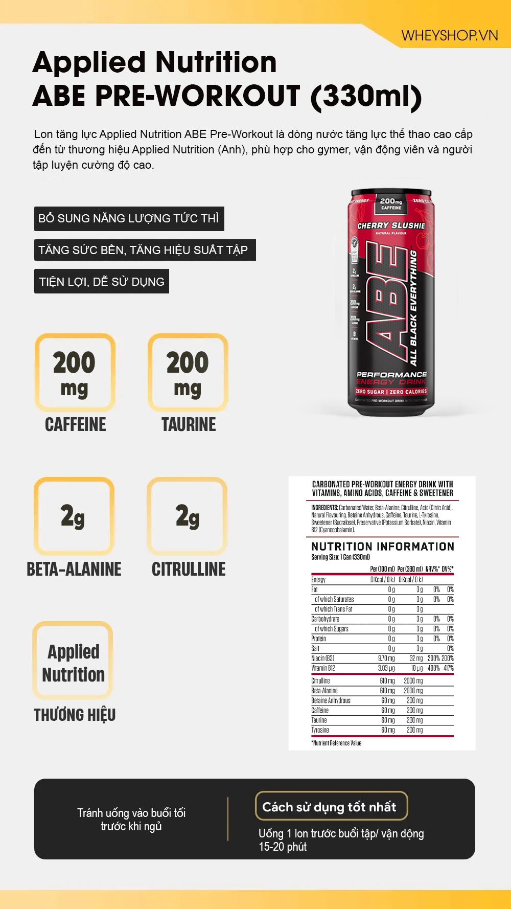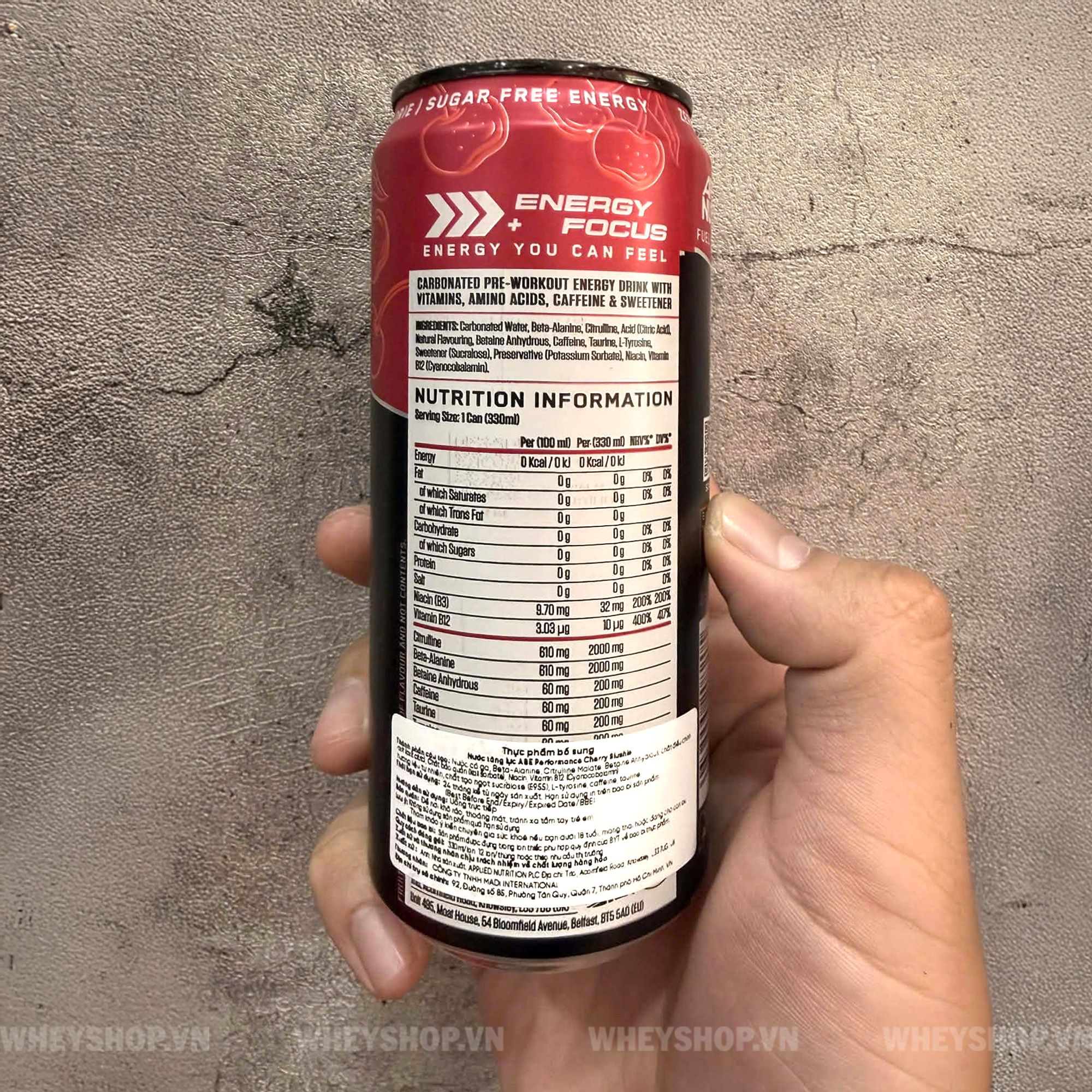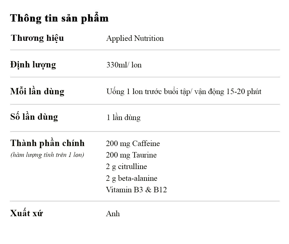 Lon tăng lực Applied Nutrition ABE Pre-Workout là dòng nước tăng lực thể thao cao cấp đến từ thương hiệu Applied Nutrition (Anh Quốc), được thiết kế dành riêng cho gymer, vận động viên và người tập luyện cường độ cao. Sản phẩm bổ sung caffeine giúp tăng tỉnh táo, citrulline, beta-alanine, taurine hỗ trợ phục hồi, tăng sức bền – giảm mệt mỏi cùng vitamin nhóm B giúp tối ưu chuyển hóa năng lượng trong suốt buổi tập. Điểm nổi bật của ABE Pre-Workout 330ml nằm ở dạng nước uống sẵn đóng lon tiện lợi, hương vị dễ uống, hấp thụ nhanh, không cần pha chế, phù hợp cho người bận rộn hoặc cần “kích hoạt” năng lượng tức thì trước khi vào tập. Đây là lựa chọn lý tưởng để đẩy cao hiệu suất, tăng sự tập trung và duy trì phong độ ổn định trong mỗi buổi luyện tập. THÀNH PHẦN CHÍNHĐịnh lượng: 330ml/ lon Số lần dùng: 1 lần dùng Thành phần chính ( hàm lượng tính trong 1 lon)