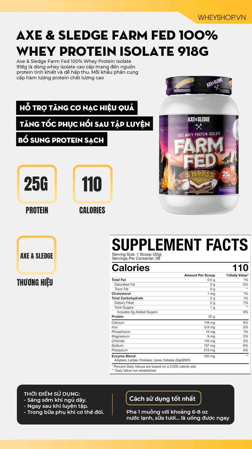 Nếu bạn đang cần một dòng whey isolate chính hãng, protein cao, macro gọn, dễ dùng hằng ngày, Axe & Sledge Farm Fed 100% Whey Protein Isolate 2Lbs (918g) là lựa chọn đáng cân nhắc.