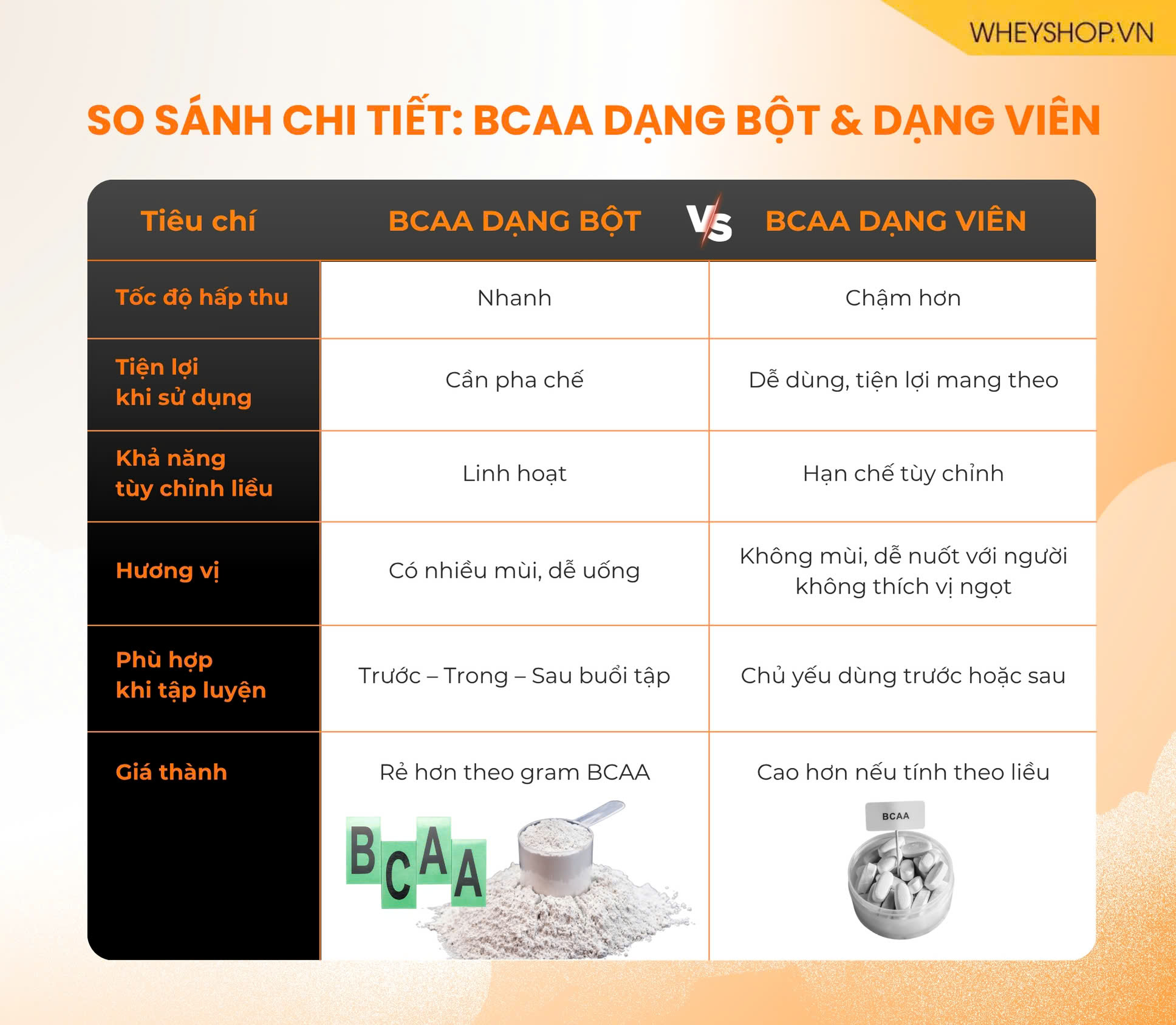 BCAA (Branched Chain Amino Acids) là một trong những thực phẩm bổ sung quen thuộc của người tập gym, thể hình, thể thao nói chung. Tuy nhiên, khi chọn mua BCAA, bạn có thể băn khoăn: " BCAA dạng bột hay viên sẽ phù hợp hơn với mình?". Dạng nào tiện hơn, hấp thu tốt hơn? Hãy cùng Wheyshop tìm hiểu trong bài viết dưới đây nhé!