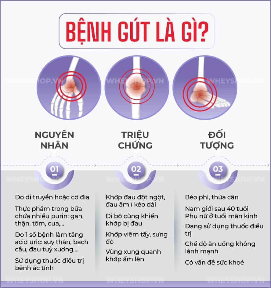 Bệnh Gout (bệnh gút) là bệnh do rối loạn chuyển hóa nhân purin trong thận, khiến thận không thể lọc axit uric từ trong máu. Với người bị bệnh gout, lượng axit uric trong máu được tích tụ qua thời gian. Nồng độ quá cao, những tinh thể nhỏ được hình thành ở khớp gây sưng tấy và đau đớn.