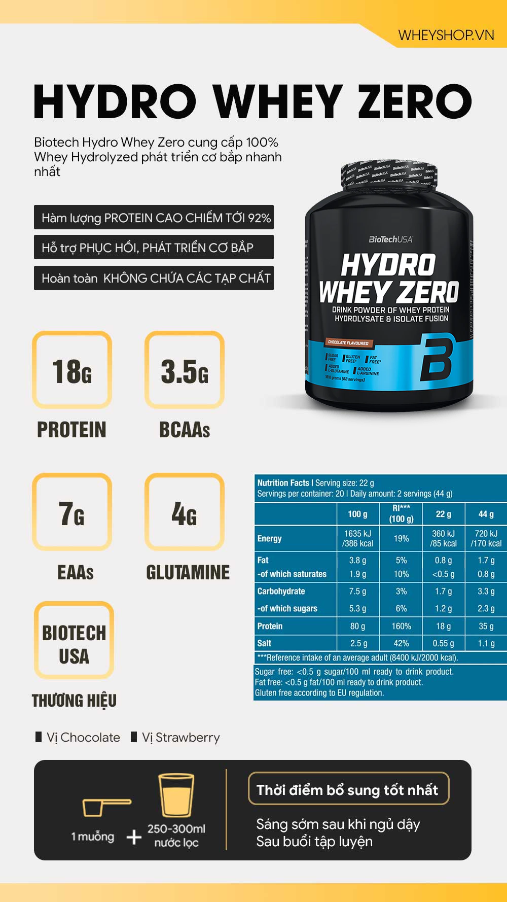 Biotech Hydro Whey Zero bổ sung 100% Whey Protein Hydrolyzed tinh khiết nhất hỗ trợ cơ bắp phát triển vượt trội. Sản phẩm của thương hiệu Biotech USA - nhập khẩu chính hãng Hungary, ứng dụng phương pháp thủy phân chính tách các phân tử protein trong thành các phân tử nhỏ giúp cơ thể hấp thụ tốt nhất và nhanh nhất, mang lại giá trị sinh học cao hơn và hiệu quả phát triển cơ bắp vượt trội hơn rất nhiều. Biotech Hydro Whey Zero với hàm lượng Protein 89% protein/lần dùng, là sản phẩm cao cấp, chất lượng và đáng dùng hàng đầu hiện nay. THÀNH PHẦN CHÍNHTrọng lượng: 4Lbs (1.8kg) Hàm lượng: 18g Protein/ lần dùng Thành phần chính: 100% Whey Hydrolyzed Amino Acid: