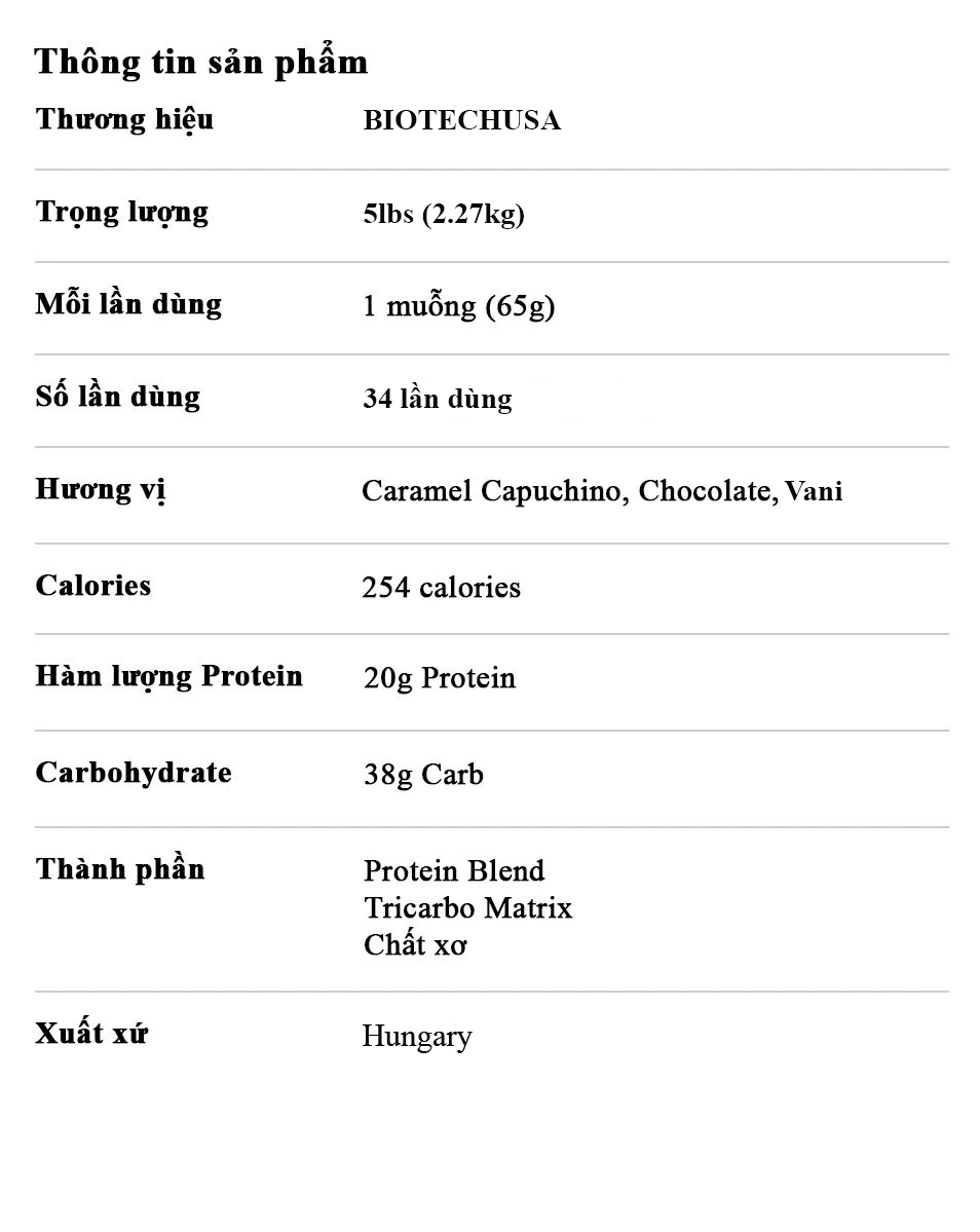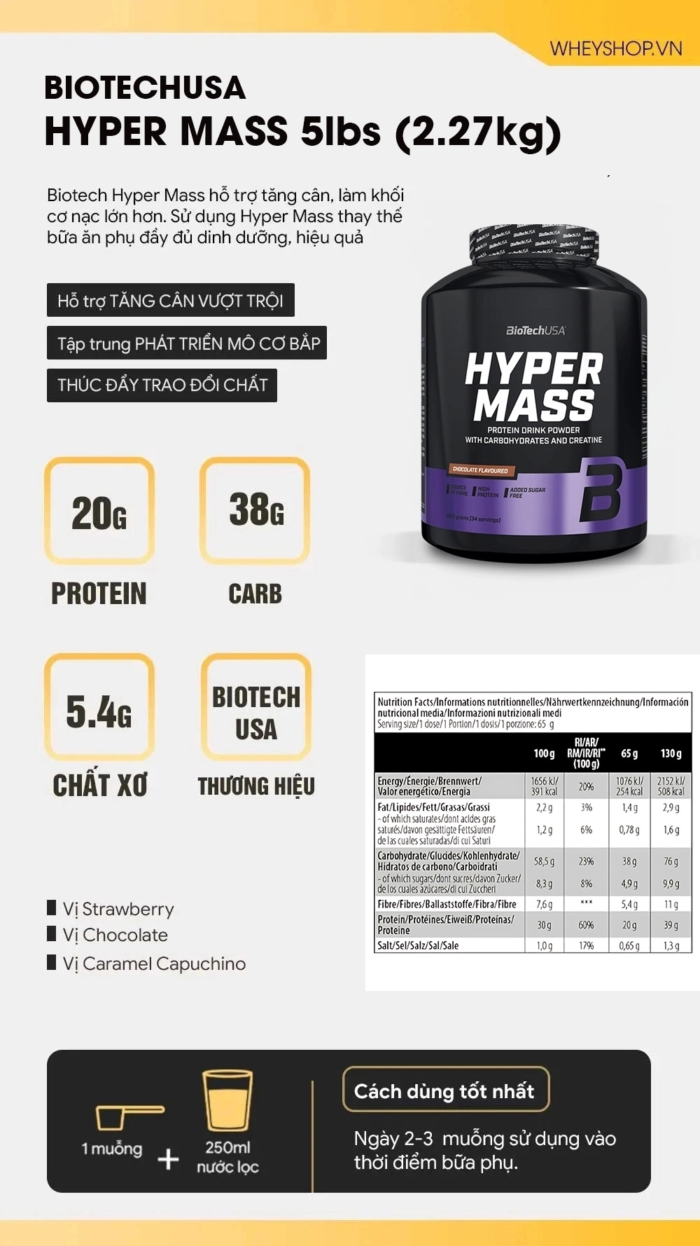 BioTechUSA đã có mặt trên thị trường từ năm 1999, cung cấp thực phẩm bổ sung cấp cao, trong đó có nhiều loại bột protein, hay Mass Gainer chất lượng, đặc biệt phải kể tới BiotechUSA Hyper Mass. Được sản xuất bởi 1 dây chuyền hiện đại, tiên tiến, trải qua các khâu kiểm nghiệm khắt khe của các tổ chức uy tín trên thế giới. BioTechUSA luôn muốn đem lại những giá trị tốt nhất cho người sử dụng. Biotech Hyper Mass hỗ trợ tăng cân, làm khối cơ nạc lớn hơn. Sản phẩm tập trung vào hàm lượng và chất lượng Protein xây dựng cơ bắp tối ưu, vượt trội. Sử dụng dòng Mass Gainer này thay thế bữa ăn phụ đầy đủ dinh dưỡng, hiệu quả. THÀNH PHẦN CHÍNHTrọng lượng: 5Lbs (2.27kg) Hàm lượng 1 muỗng: 65g Hàm lượng Calo: 254 Calo/ serving Số làn dùng: 34 lần dùng Thành phần khác:
