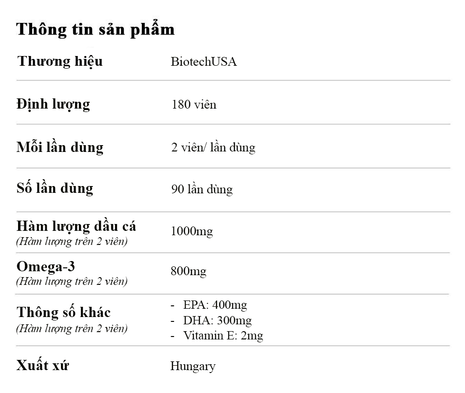 Biotech Mega Omega-3 là dòng thực phẩm bổ sung Omega-3 cao cấp đến từ thương hiệu Biotech USA – nổi tiếng thế giới với các sản phẩm hỗ trợ sức khỏe và thể hình. Mỗi viên nang mềm chứa hàm lượng EPA và DHA dồi dào, hỗ trợ tim mạch, tăng cường trí não và cải thiện thị lực một cách toàn diện. Với thành phần tinh khiết, được chưng cất phân tử để loại bỏ kim loại nặng và tạp chất, sản phẩm phù hợp sử dụng lâu dài cho cả người lớn, người cao tuổi và người tập luyện thể thao. THÀNH PHẦN CHÍNHThương hiệu: BiotechUSA Xuất xứ: Hungary Định lượng: 180 viên Mỗi lần dùng: 2 viên/ lần dùng Số lần dùng: 90 lần dùng Thành phần chính (hàm lượng trên 2 viên)