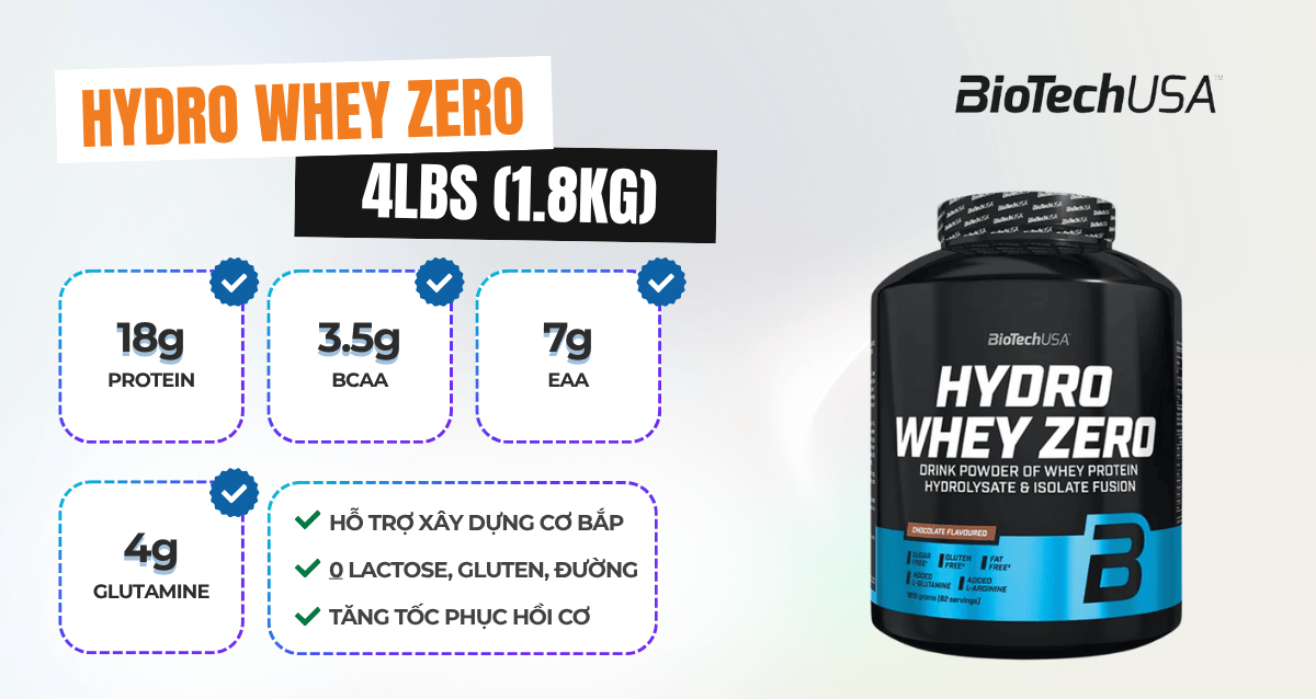 BioTechUSA Hydro Whey Zero là dòng Whey Protein cao cấp sử dụng công nghệ thủy phân (WPH) giúp cho tốc độ hấp thu protein siêu nhanh. Sản phẩm này phù hợp với người tập luyện cường độ cao, cần phục hồi cơ bắp tức thì.