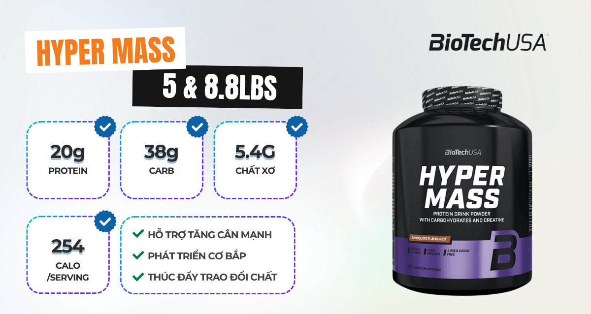 BiotechUSA Hyper Mass là dòng mass gainer tăng cân – tăng cơ sạch nổi bật của hãng, được thiết kế dành riêng cho người gầy, khó tăng cân. Công thức cân đối giữa carb – protein – chất béo lành mạnh, giúp bổ sung năng lượng dồi dào mà không gây tích mỡ thừa.