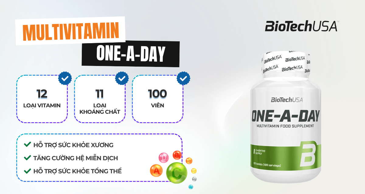 BiotechUSA One-A-Day là dòng vitamin tổng hợp 1 viên/ngày, cung cấp hơn 25 loại vitamin và khoáng chất thiết yếu giúp cơ thể luôn khỏe mạnh, giảm mệt mỏi và tăng sức đề kháng. Đây là lựa chọn hoàn hảo cho gymer, người làm việc cường độ cao hoặc thường xuyên thiếu hụt vi chất.