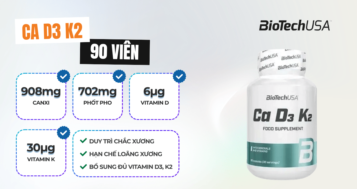 BiotechUSA Ca D3 K2 là sự kết hợp thông minh giữa canxi, vitamin D3 và K2, giúp xương chắc khỏe, đồng thời hỗ trợ tuần hoàn máu và tim mạch. Công thức này đặc biệt phù hợp với người tập thể hình, vận động viên hoặc người lớn tuổi cần bảo vệ hệ xương khớp.