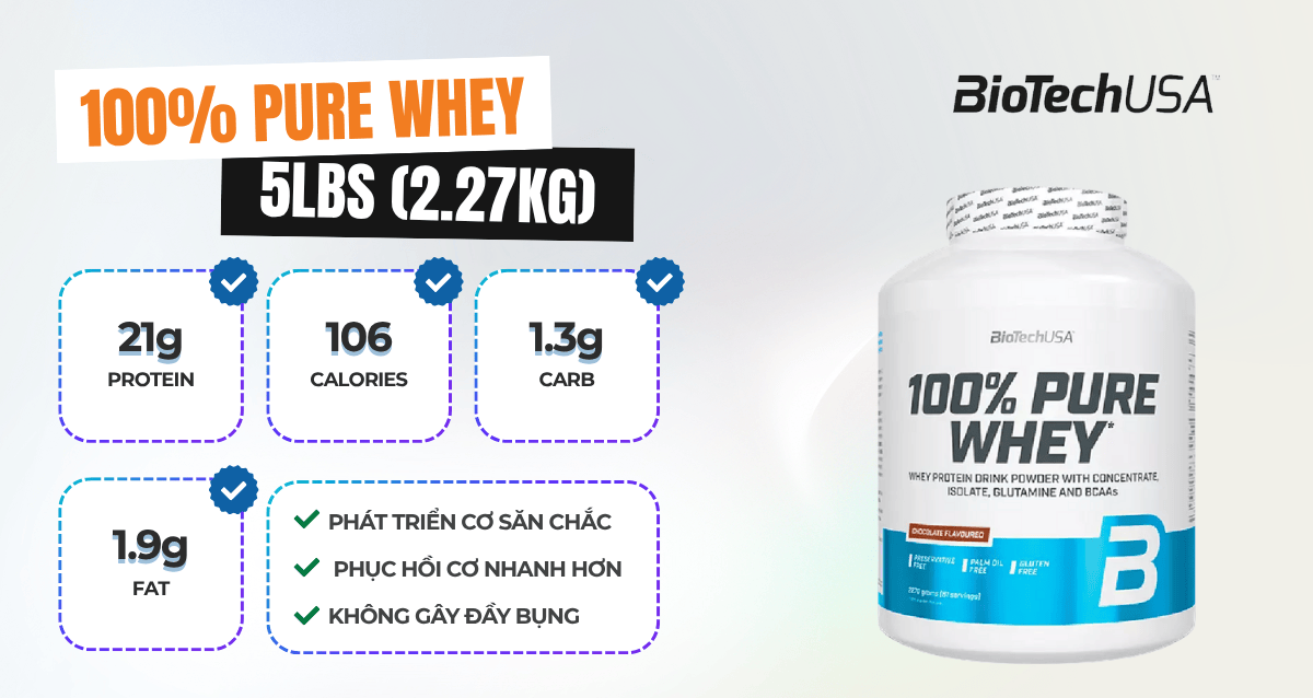 BiotechUSA 100% Pure Whey là dòng whey “quốc dân” của hãng, được yêu thích nhờ hương vị ngon, dễ uống và hiệu quả rõ rệt trong việc tăng cơ – phục hồi. Sản phẩm kết hợp giữa Whey Concentrate và Isolate, giúp cân bằng giữa giá thành và hiệu suất dinh dưỡng.