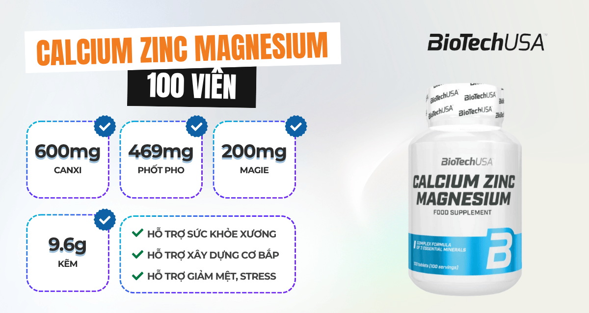 BiotechUSA Calcium Zinc Magnesium là sự kết hợp của 3 khoáng chất quan trọng nhất cho gymer: canxi, kẽm và magie. Sản phẩm hỗ trợ phục hồi cơ – cải thiện giấc ngủ – tăng cường sức mạnh, đồng thời giúp cân bằng điện giải sau tập luyện cường độ cao.