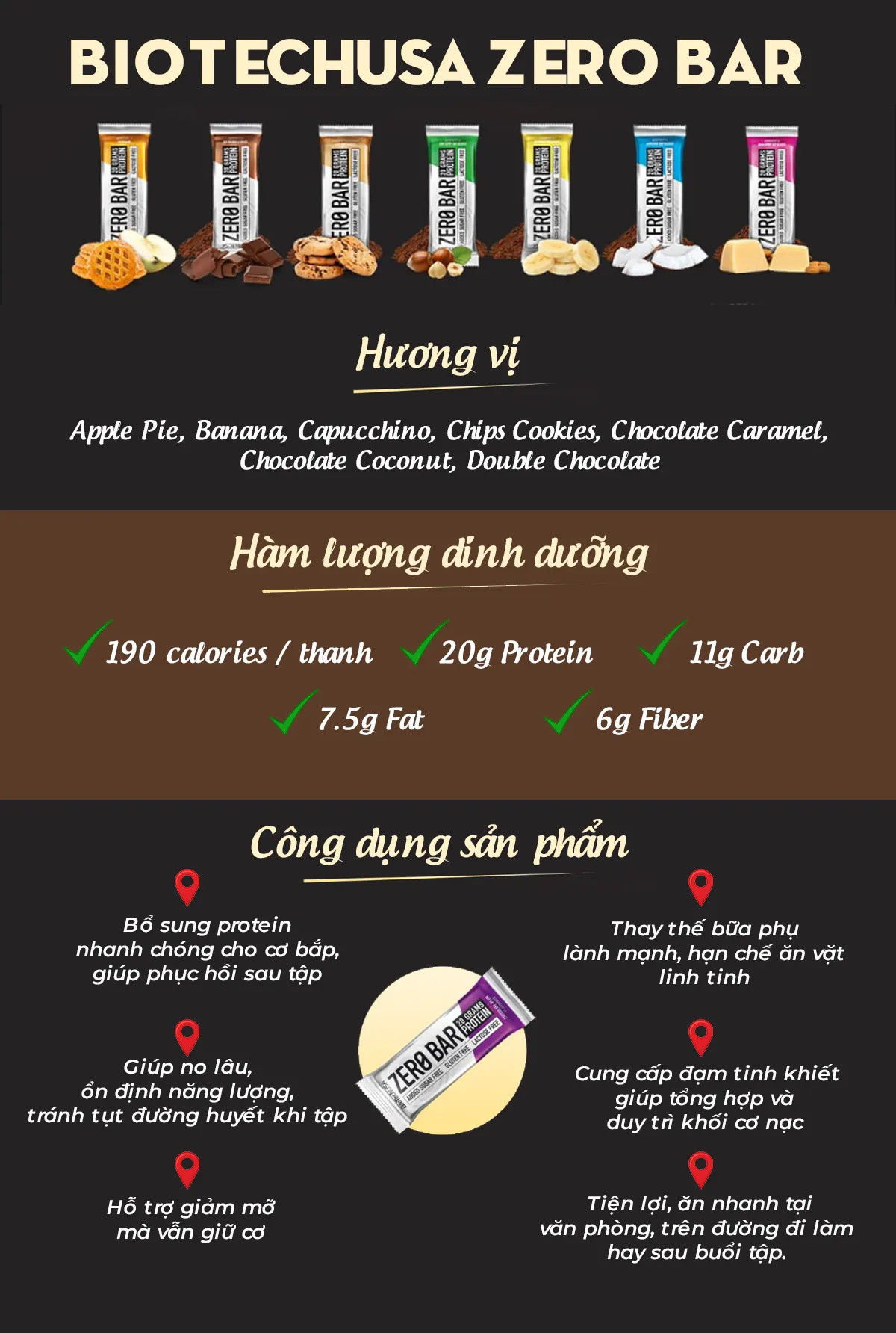 Zero Bar được thiết kế như một bữa ăn nhỏ gọn, cung cấp 20g protein trong mỗi thanh, giúp cơ thể tăng cơ – phục hồi sau tập – no lâu mà không cần nạp thêm đường hay tinh bột xấu.