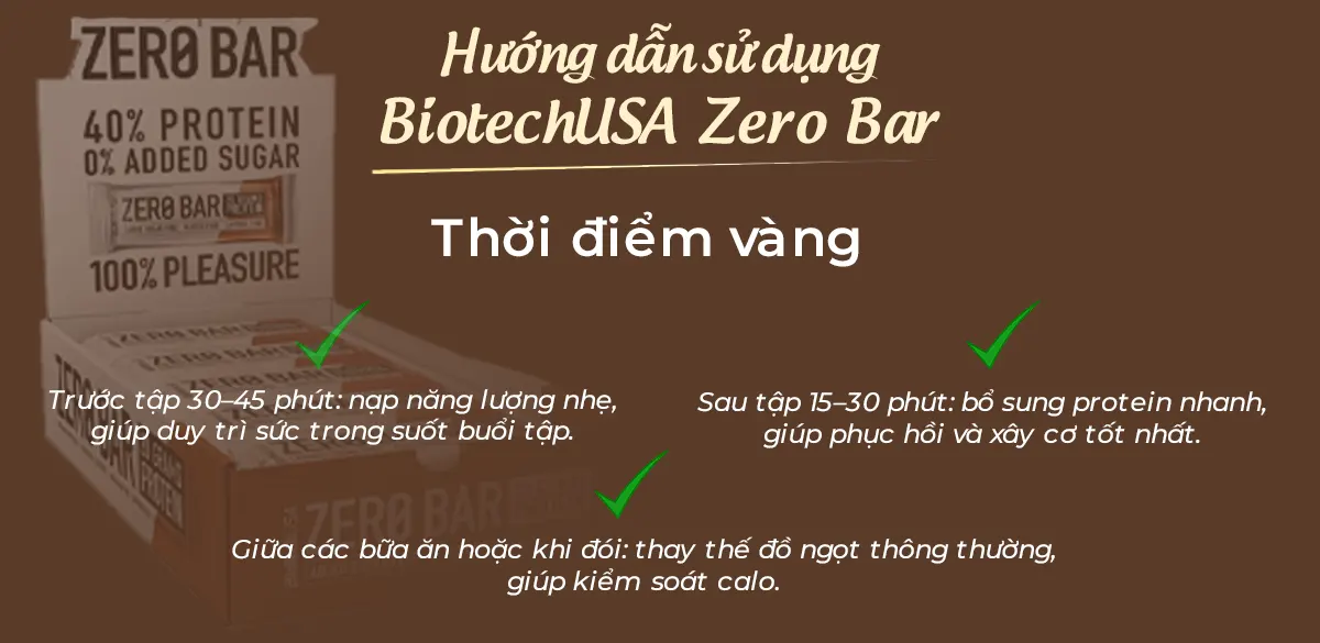 Gợi ý: Kết hợp Zero Bar với whey isolate hoặc BCAA sẽ tối ưu hơn cho quá trình phục hồi cơ.