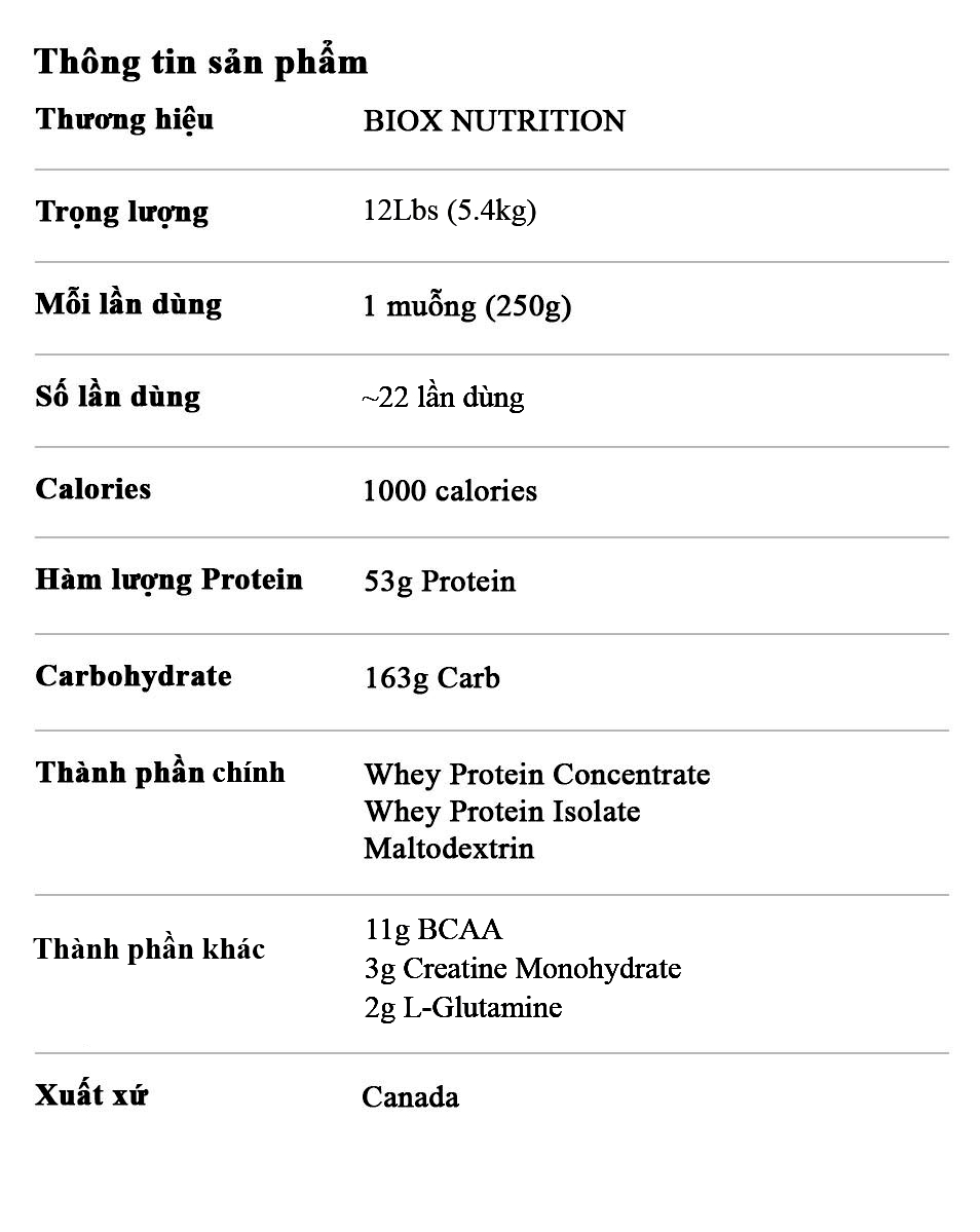 Sản phẩm này cung cấp thêm calorie và dưỡng chất cần thiết để hỗ trợ việc tăng cân và xây dựng cơ bắp, cung cấp năng lượng và hỗ trợ phục hồi sau khi tập luyện.