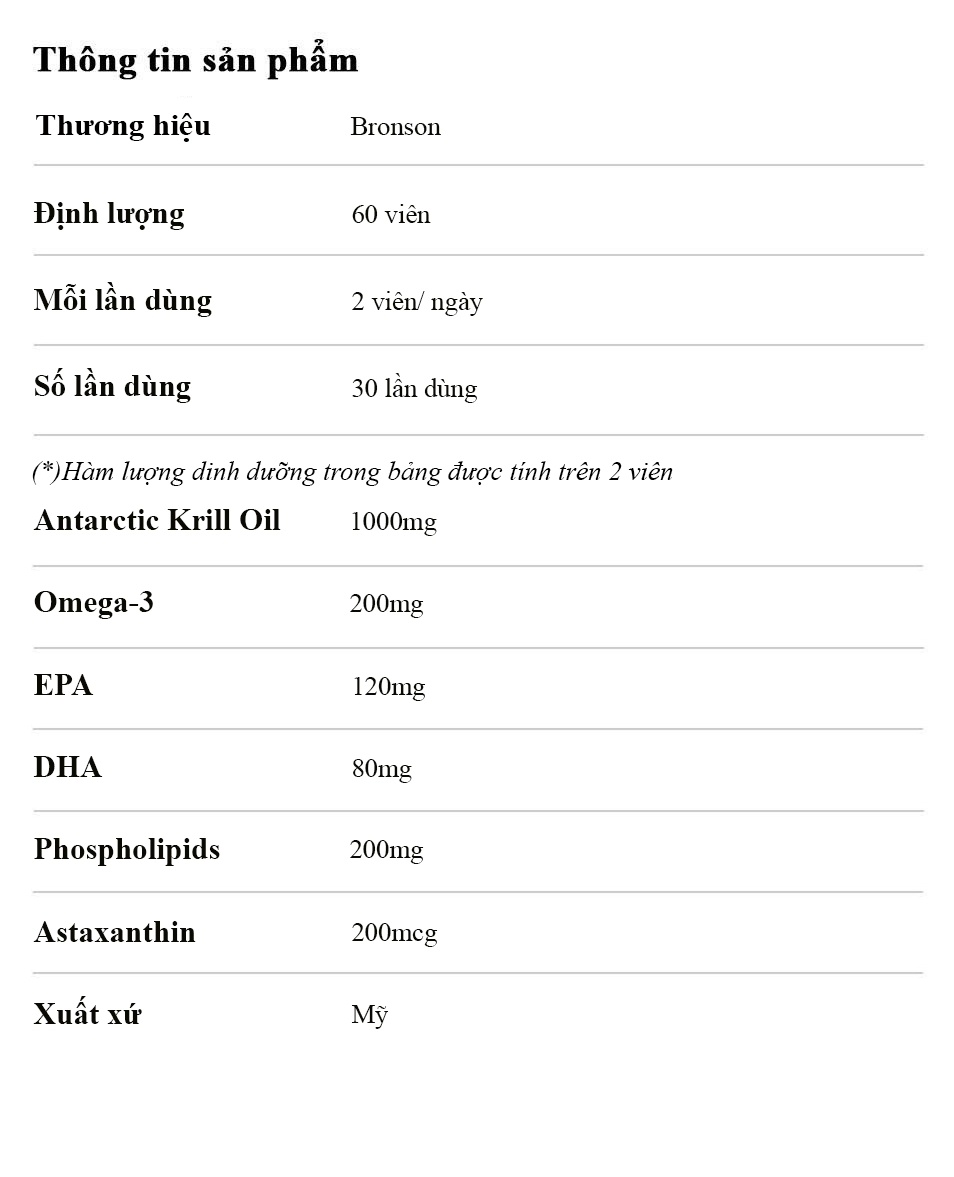 Dầu nhuyễn thể Bronson Antarctic Krill Oil Omega-3 EPA/DHA 1000 mg là lựa chọn tốt cho sức khỏe tim mạch, não bộ và khớp. Sản phẩm được chiết xuất từ loài krill sống ở vùng biển sạch và lạnh của Nam Cực. Đây là nguồn nguyên liệu tinh khiết và giàu dinh dưỡng. Mỗi viên nang mềm chứa 1000 mg dầu nhuyễn thể tự nhiên. Nó cung cấp axit béo Omega-3 EPA và DHA ở dạng phospholipid. Điều này giúp cơ thể hấp thu tốt hơn so với Omega-3 từ dầu cá thông thường. Sản phẩm cũng chứa Astaxanthin, một chất chống oxy hóa mạnh, giúp bảo vệ tế bào khỏi gốc tự do.