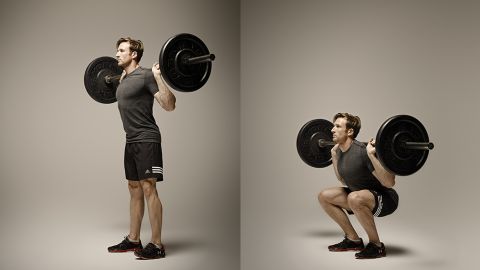 - Gồng chặt cơ thể, đẩy mông ra sau hạ thấp thân người từ từ có kiểm soát, cho đến khi đùi bạn song song với sàn. Lưu ý thanh tạ nằm giữa bàn chân bạn.
