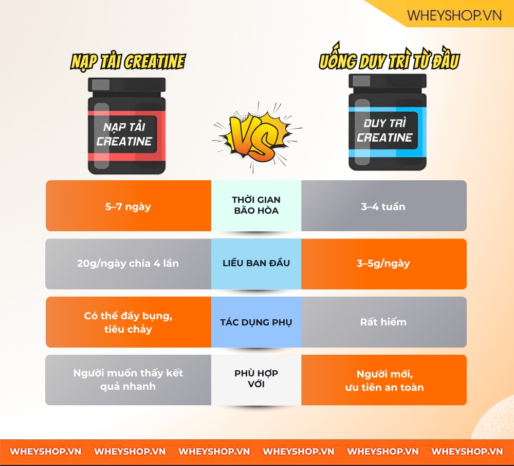 Để tận dụng tối đa hiệu quả của Creatine, bạn cần hiểu có hai cách sử dụng phổ biến hiện nay: nạp tải Creatine và dùng liều duy trì ngay từ đầu. Cả hai đều hiệu quả, nhưng khác nhau về tốc độ bão hòa và độ tiện lợi. Cùng xem chi tiết từng cách nhé!