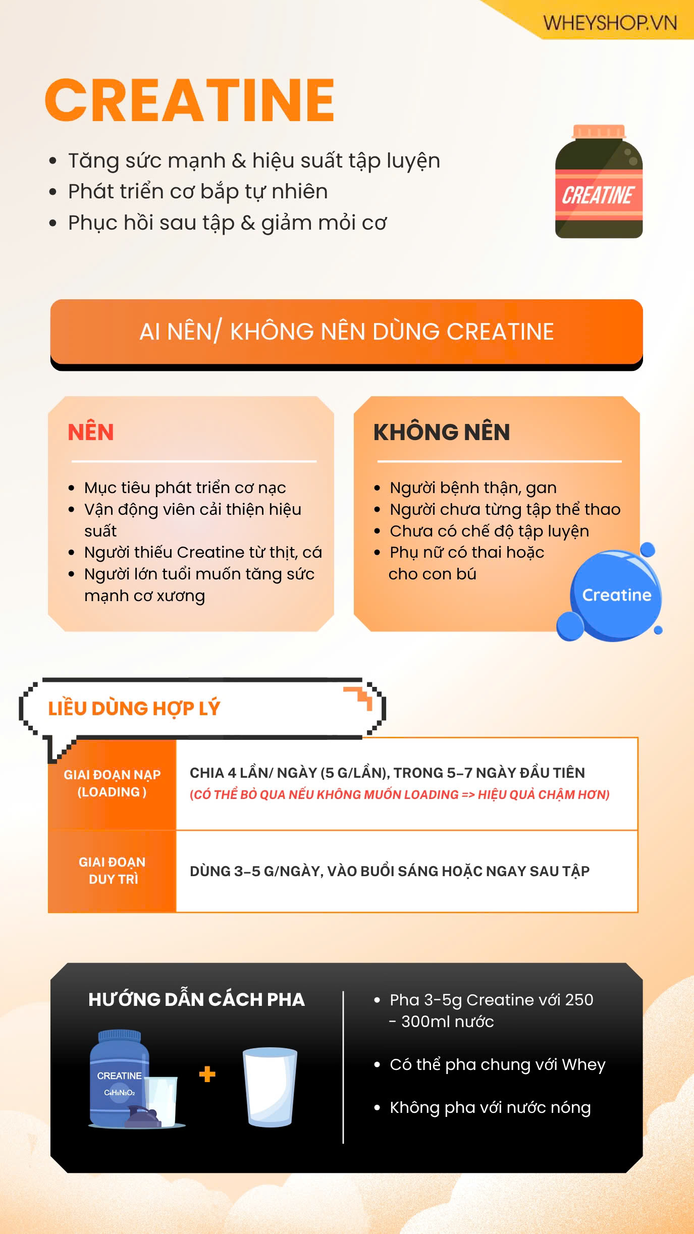 Creatine là một hợp chất tự nhiên có trong cơ bắp. Khi bạn tập cường độ cao, Creatine giúp tái tạo năng lượng nhanh chóng bằng cách sản xuất ATP – nguồn năng lượng chính giúp bạn nâng tạ mạnh hơn, tập lâu hơn và phục hồi tốt hơn. Tuy nhiên, Creatine không phải chất kích thích.