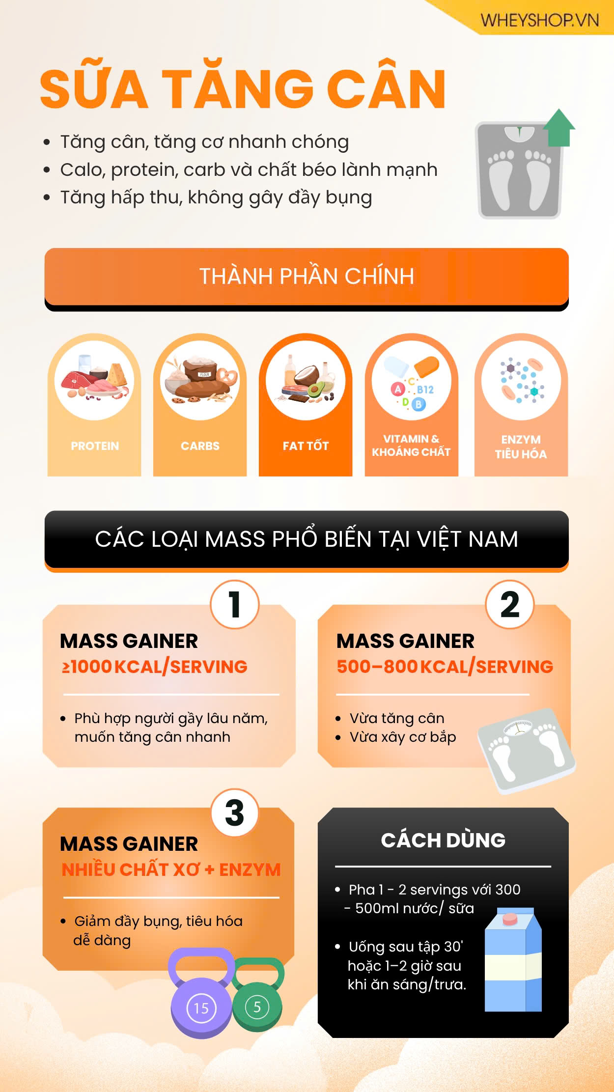 Sữa tăng cân Mass Gainer là sản phẩm sữa bột giàu dinh dưỡng gồm protein, carb, fat. vitamin khoáng chất, enzyme tiêu hóa,... cung cấp hàm lượng lớn calories cho cơ thể, giúp hỗ trợ tăng cân, cải thiện vóc dáng cho người gầy hoặc thay thế bữa ăn phụ tiện lợi.