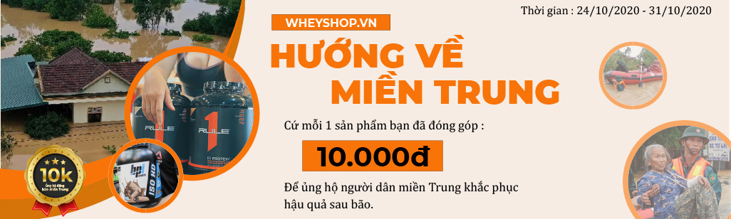 Mỗi đơn hàng bất k�� tại hệ thống cửa hàng WheyShop trên toàn quốc là bạn đã đóng góp 10.000đ vào quỹ ủng hộ đồng bào vùng lũ. Kết thúc chương trình, WheyShop sẽ thống kê, tổng hợp số tiền ủng hộ và gửi đến cho các đơn vị uy tín ủng hộ đồng bào miền Trung.