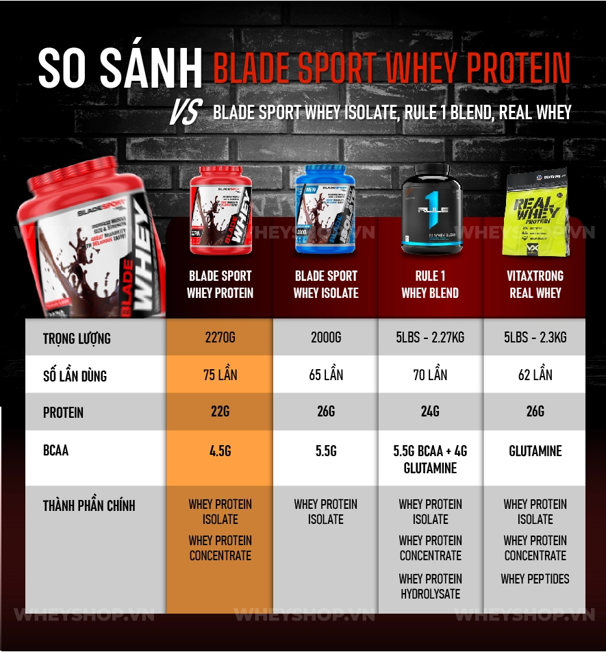 3. So sánh đánh giá Blade Sport Whey Protein vs Blade Sport Whey Isolate, Rule 1 Whey Blend, VitaXtrong Real Whey