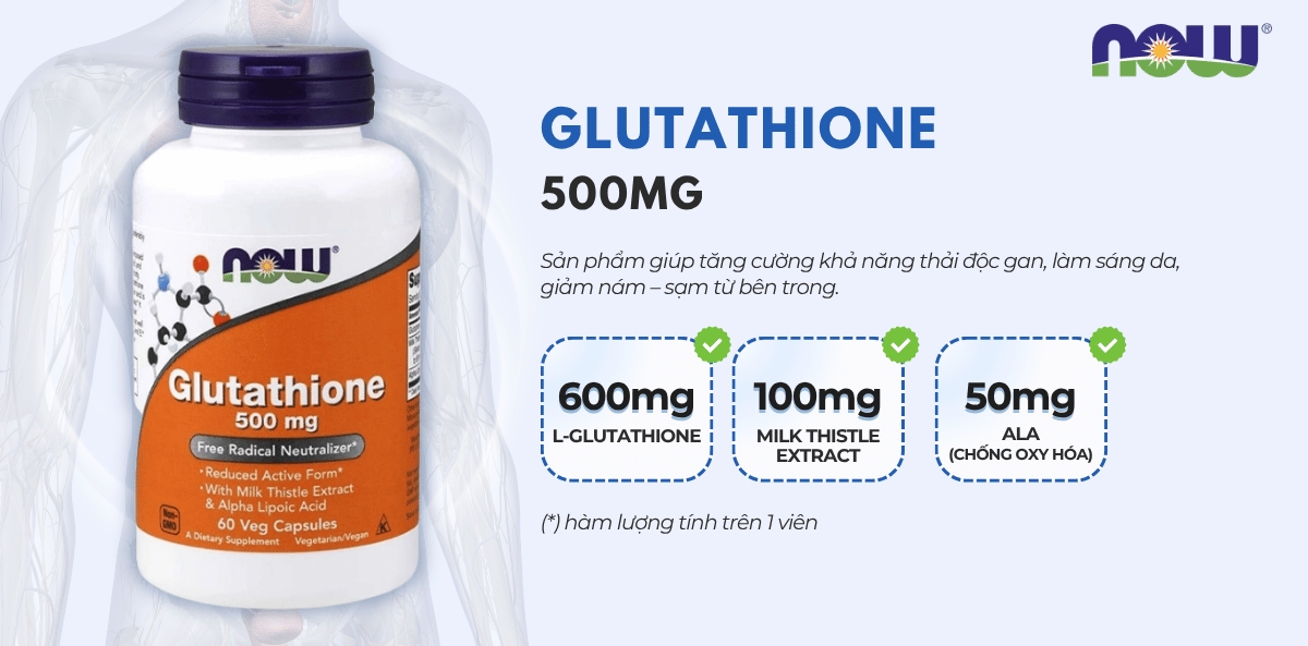 Now Glutathione 500mg là sản phẩm đến từ thương hiệu NOW Foods của Mỹ – thương hiệu thực phẩm bổ sung hàng đầu thế giới. Với hàm lượng 500mg Glutathione nguyên chất kết hợp cùng Milk Thistle Extract và Alpha Lipoic Acid, sản phẩm giúp tăng cường khả năng thải độc gan, làm sáng da, giảm nám – sạm từ bên trong. Đây cũng là một trong những sản phẩm Glutathione được ưa chuộng nhất tại thị trường Mỹ và Việt Nam.