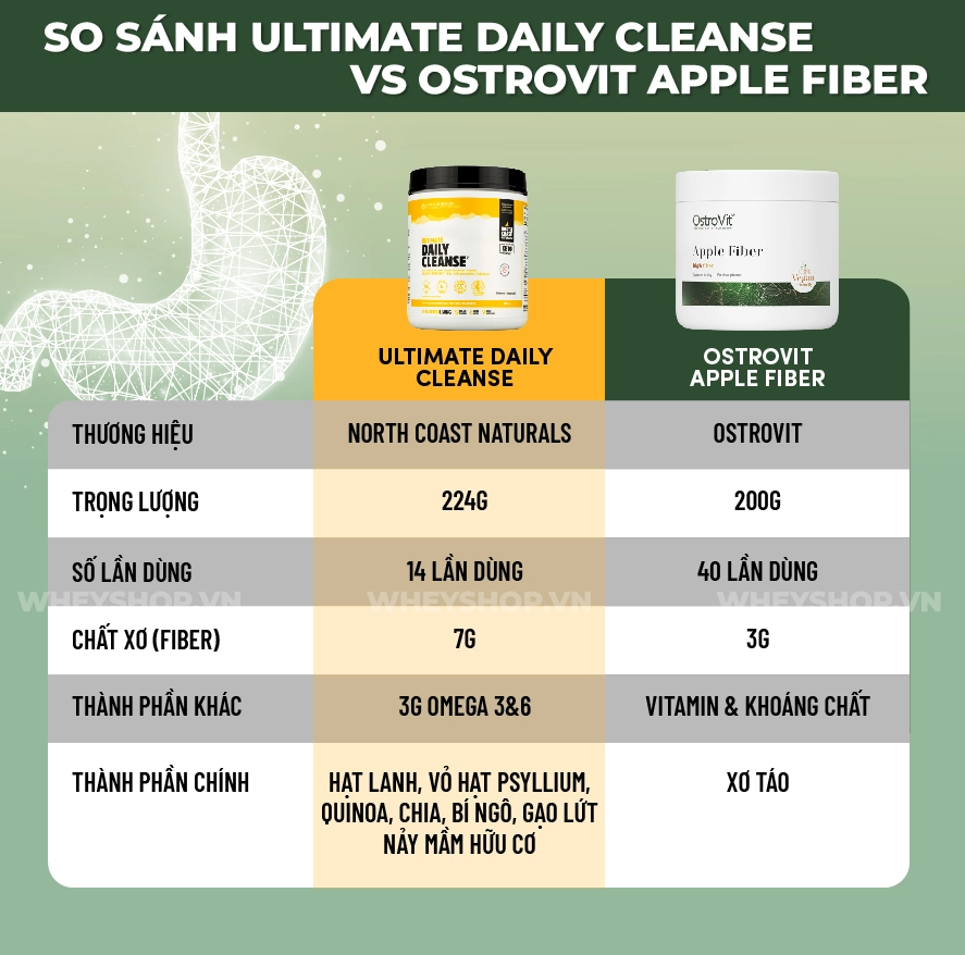 Ultimate Daily Cleanse bổ sung 7g chất xơ cho mỗi lần dùng, còn mỗi lần dùng Ostrovit Apple Fiber bổ sung tương đương 3g chất xơ. Như vậy, Ultimate Daily Cleanse review đánh giá đem lại hiệu quả cải thiện hệ tiêu hóa, hỗ trợ giảm cân hiệu quả hơn so với Ostrovit Apple Fiber.