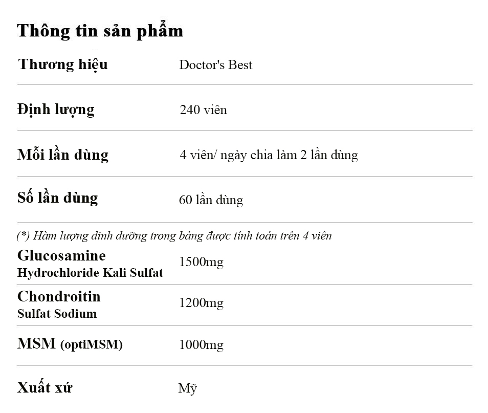 Doctor's Best Glucosamine Chondroitin MSM là sản phẩm bổ khớp cao cấp đến từ thương hiệu dược phẩm uy tín Doctor’s Best (Mỹ), được thiết kế dành riêng cho người gặp vấn đề về xương khớp, thoái hóa, đau nhức khi vận động hoặc muốn duy trì sức khỏe khớp lâu dài. Sản phẩm sở hữu công thức phối hợp 3 thành phần “vàng” gồm Glucosamine Sulfate, Chondroitin Sulfate và MSM Với hiệu quả bền vững, bảng thành phần sạch - không chứa GMO hay chất gây dị ứng phổ biến, Doctor's Best Glucosamine Chondroitin MSM là lựa chọn lý tưởng cho người lớn tuổi, người chơi thể thao hoặc bất kỳ ai muốn chăm sóc hệ vận động toàn diện. Sản phẩm được sản xuất theo tiêu chuẩn nghiêm ngặt tại Mỹ, đảm bảo độ tinh khiết, hàm lượng chính xác và khả năng hấp thụ tối ưu. Việc bổ sung Glucosamine và Chondroitin giúp tái tạo sụn khớp, trong khi MSM hỗ trợ kháng viêm tự nhiên, giảm đau mỏi do thoái hóa hoặc vận động cường độ cao. Sử dụng đều đặn giúp cải thiện chất lượng cuộc sống, tăng khả năng vận động và hạn chế các biến chứng liên quan đến thoái hóa khớp theo tuổi tác. |