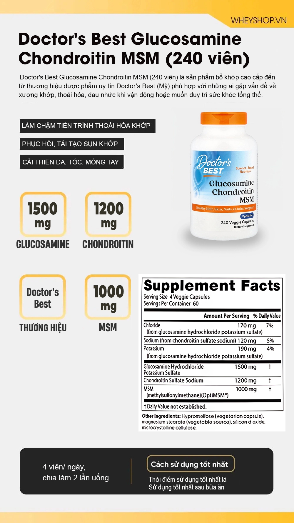 WheyShop là hệ thống bán lẻ thực phẩm bổ sung uy tín hàng đầu tại Việt Nam, được nhiều vận động viên và người tiêu dùng tin tưởng lựa chọn. WheyShop cam kết cung cấp sản phẩm Doctor's Best Glucosamine Chondroitin MSM chính hãng, có đầy đủ giấy tờ chứng nhận nguồn gốc và chất lượng. Đội ngũ tư vấn viên chuyên nghiệp, giàu kinh nghiệm, sẵn sàng hỗ trợ khách hàng lựa chọn sản phẩm phù hợp và giải đáp mọi thắc mắc.