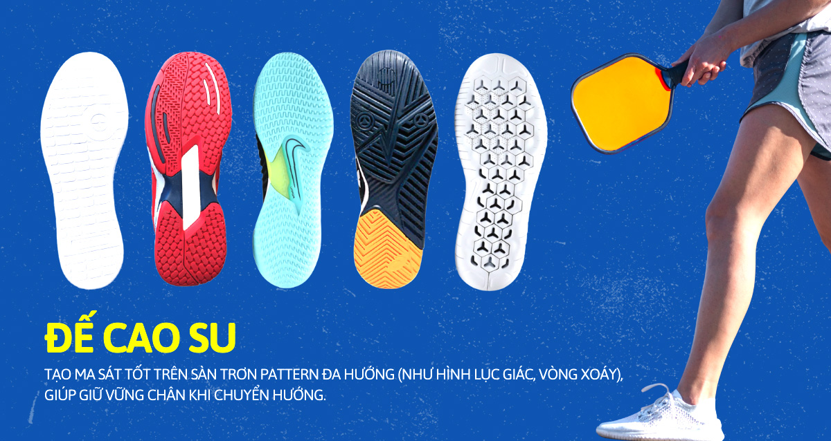 Pickleball yêu cầu di chuyển bên nhanh và dừng gấp. Do đó, giày cần có đế cao su tạo ma sát tốt trên sàn trơn (gỗ, vinyl). Các mẫu thường dùng pattern đa hướng (như hình lục giác, vòng xoáy), giúp giữ vững chân khi chuyển hướng. Những giày này ổn định hơn giày chạy bộ vốn thiết kế cho chuyển động tiến - lùi.