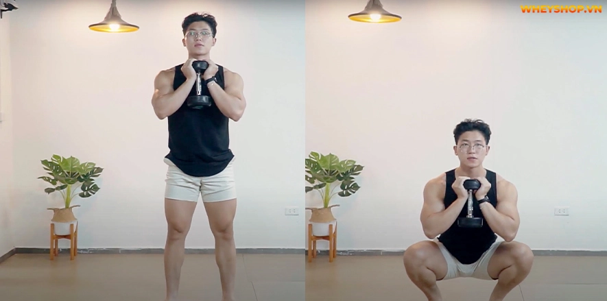 Dumbbell Squat có nghĩa là “Squat với tạ đơn”, theo đó các động tác trong bài tập chân gym này sẽ tác động nhiều lên cơ đùi trước và tác động một phần lên cơ mông, cơ đùi sau, bắp chân. Tập luyện Dumbbell Squat đúng cách và thường xuyên sẽ giúp nam giới sở hữu cho mình cặp đùi to khỏe và với nữ giới, sẽ giúp bạn gái giảm mỡ đùi rất tốt.