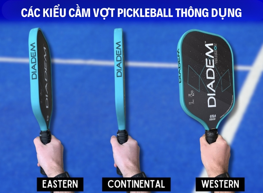 Trong môn pickleball, có ba kiểu cầm vợt thông dụng: Continental Grip (trung tính, đa năng, phù hợp cho việc chơi đôi và các pha volley gần lưới), Eastern Forehand Grip (dễ dàng tiếp thu, tạo ra cú forehand mạnh, thích hợp cho người mới bắt đầu) và Western Grip (tạo ra topspin lớn, thích hợp cho những người chơi có trình độ cao).