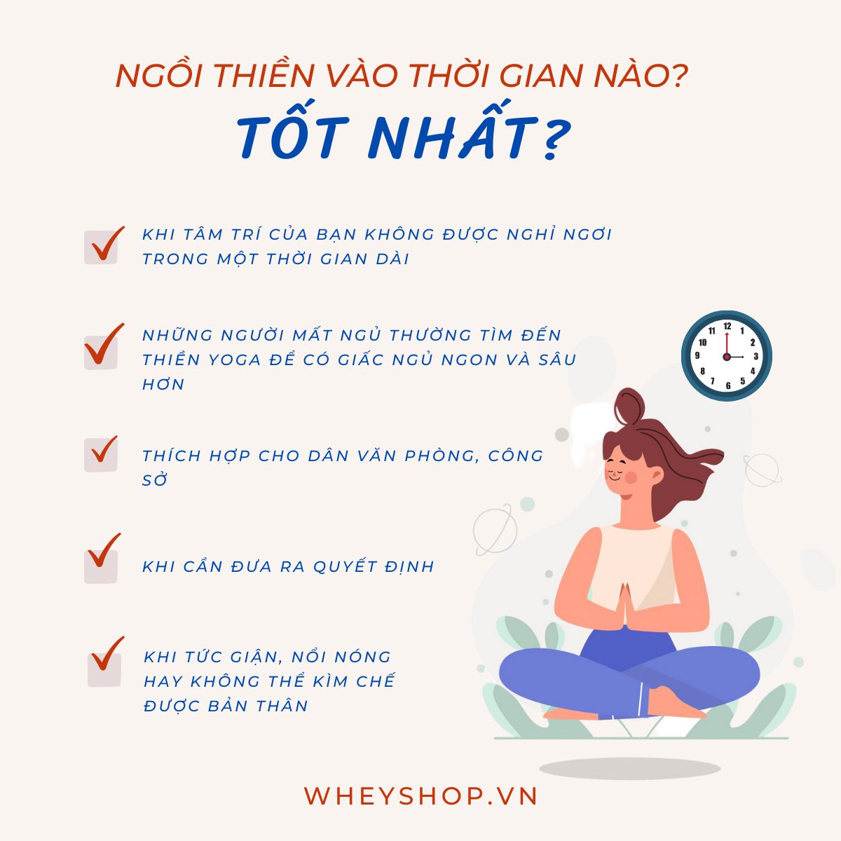 Trong các buổi tập, ngồi thiền Yoga thường được thực hiện mỗi khi kết thúc để người tập có thẻ thư giãn. Tuy nhiên, nếu bạn thực hiện thiền Yoga tại nhà hoặc là người mới tập, nên lựa chọn một trong những thời điểm thích hợp sau để luyện tập và đạt được hiệu quả tốt nhất: