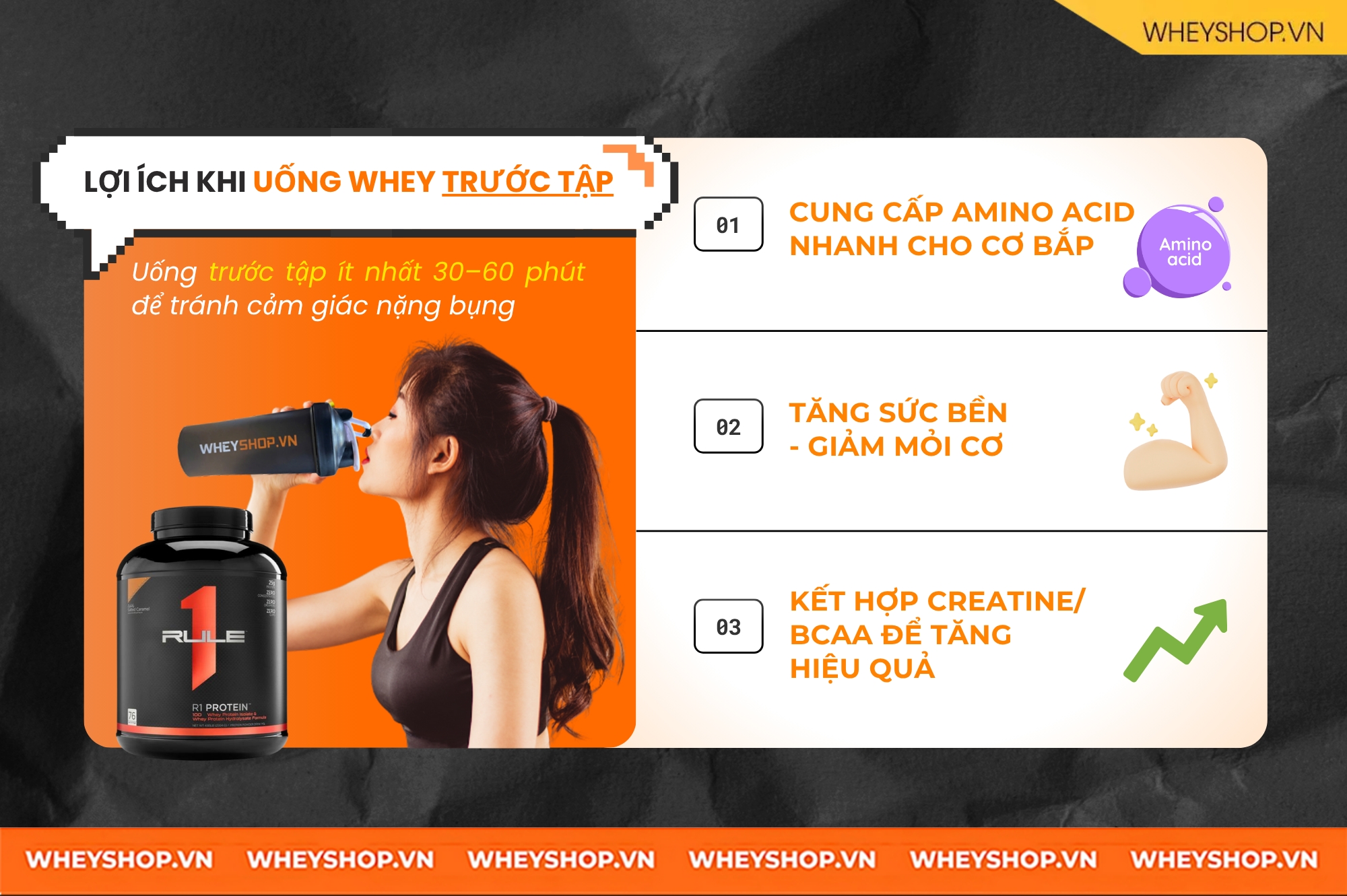 Lưu ý: Uống whey trước tập ít nhất 30–60 phút để tránh cảm giác nặng bụng khi vận động.