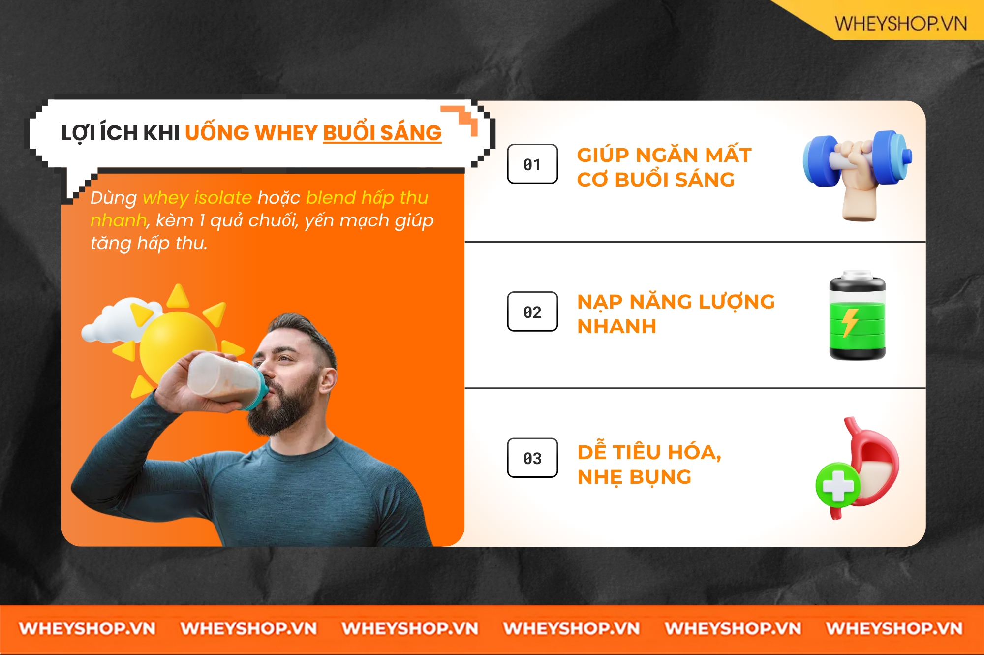 Sau 7-8 tiếng ngủ, cơ thể bạn bước vào trạng thái “catabolic” (phân giải mô cơ để làm năng lượng). Việc bổ sung 1 khẩu phần whey ngay sau khi thức dậy sẽ:
