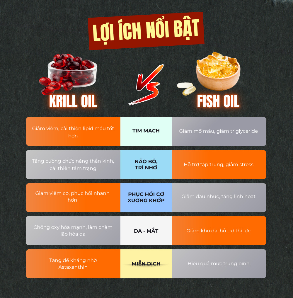 Trong Fish Oil, Omega-3 tồn tại ở dạng triglyceride, hấp thu chậm hơn và dễ bị oxy hóa, nên thường phải bổ sung thêm vitamin E để ổn định. Ngược lại, Krill Oil chứa Omega-3 dạng phospholipid – cấu trúc tương tự màng tế bào, giúp cơ thể hấp thu nhanh và hiệu quả hơn. Đặc biệt, Krill Oil còn có Astaxanthin, chất chống oxy hóa mạnh gấp 50 lần vitamin E, giúp bảo vệ tế bào, giảm viêm và tăng khả năng phục hồi.
