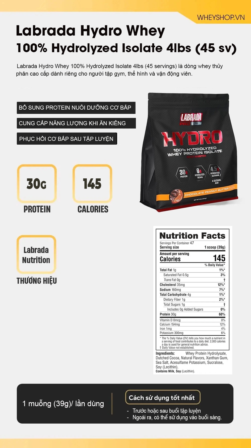 | Labrada Hydro Whey 100% Hydrolyzed Isolate là dòng whey protein thủy phân cao cấp được thiết kế dành riêng cho người tập gym, thể hình và vận động viên cần phục hồi cơ bắp nhanh chóng. Với nguồn protein isolate thủy phân tinh khiết, sản phẩm mang đến tốc độ hấp thu vượt trội, giúp bổ sung đạm nhanh chóng sau tập, hỗ trợ xây dựng và phát triển cơ bắp hiệu quả. THÀNH PHẦN CHÍNHĐịnh lượng: 4lbs Mỗi lần dùng: 1 muỗng (39g) Số lần dùng: 45 lần dùng Hàm lượng Protein: 30g Protein Calories: 145 Calories/ serving Các hàm lượng khác: