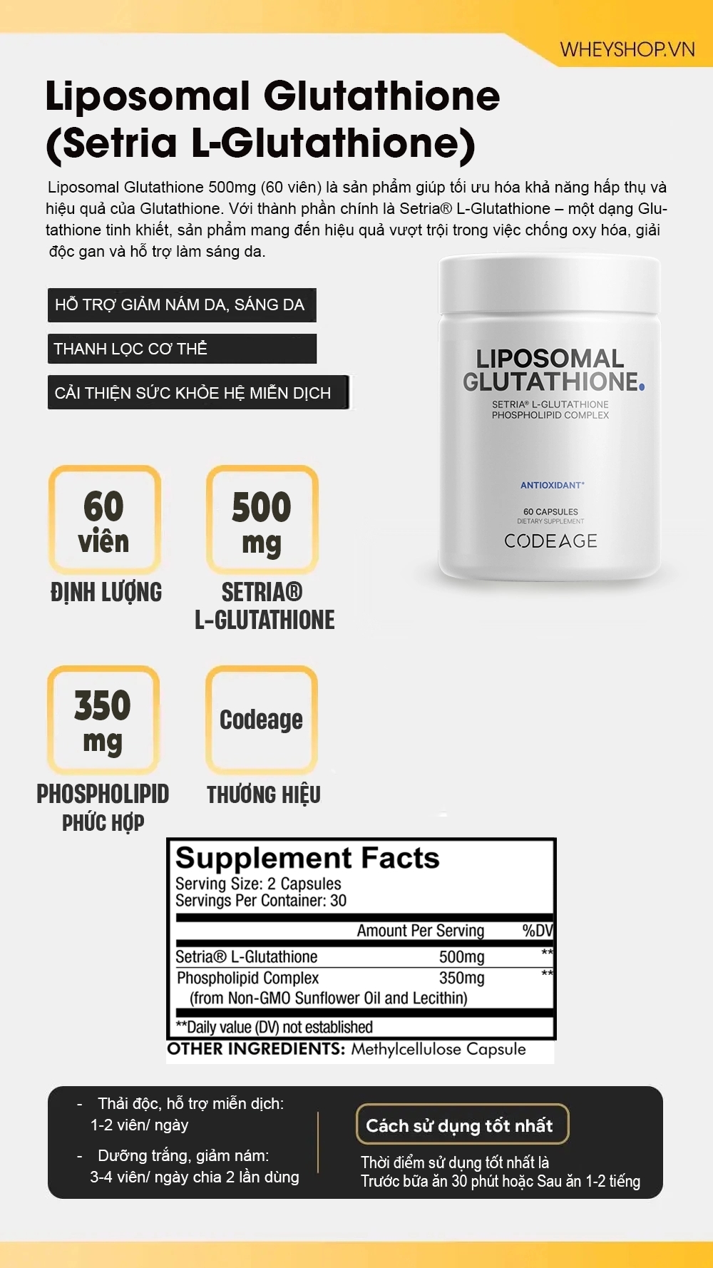 Liposomal Glutathione 500mg giúp chống oxy hóa, làm da trắng sáng và giảm nám.