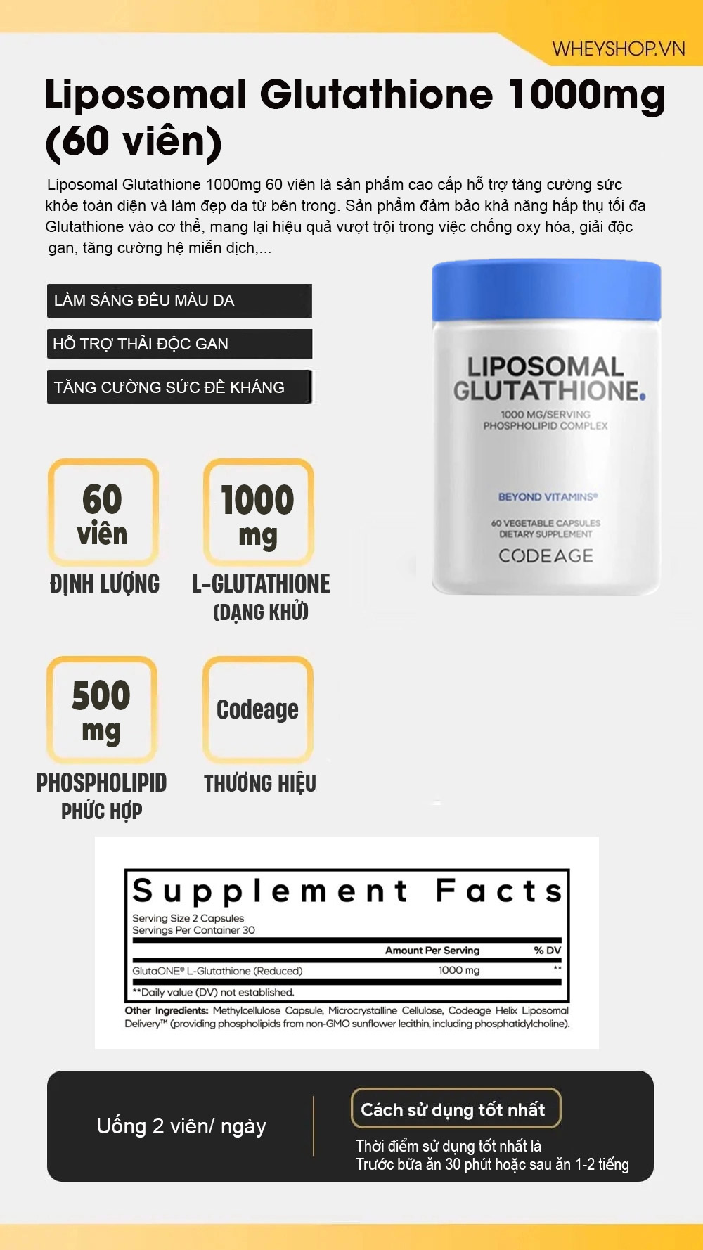 Liposomal Glutathione 1000mg là sản phẩm cao cấp của thương hiệu Codeage, hỗ trợ tăng cường sức khỏe toàn diện và làm đẹp da từ bên trong. Với công nghệ Liposomal tiên tiến, sản phẩm đảm bảo khả năng hấp thụ tối đa Glutathione vào cơ thể, mang lại hiệu quả vượt trội trong việc chống oxy hóa, giải độc gan và tăng cường hệ miễn dịch. Glutathione được mệnh danh là "chất chống oxy hóa mạnh nhất" trong cơ thể, giúp trung hòa các gốc tự do, ngăn ngừa lão hóa và hỗ trợ làm sáng da hiệu quả. Sản phẩm Liposomal Glutathione phù hợp với những người thường xuyên tiếp xúc với môi trường ô nhiễm, căng thẳng, hoặc có nhu cầu cải thiện sức khỏe làn da. Với liều dùng tiện lợi, mỗi ngày chỉ cần 2 viên, bạn sẽ cảm nhận được sự thay đổi rõ rệt về sức khỏe và làn da chỉ sau một thời gian ngắn sử dụng. Sản phẩm được sản xuất theo tiêu chuẩn chất lượng quốc tế, đảm bảo an toàn và hiệu quả cho người dùng. 3 KHÔNG: