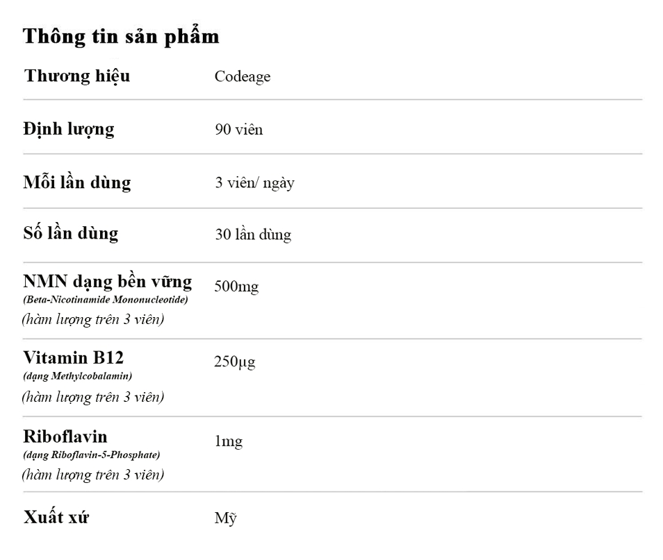 Liposomal NMN là sản phẩm cao cấp của thương hiệu Codeage, được nghiên cứu và phát triển với công nghệ Liposome tiên tiến. Với công nghệ Liposome, NMN được bảo vệ nguyên vẹn khi đi qua hệ tiêu hóa, đảm bảo hoạt chất được hấp thụ tối đa vào cơ thể. Sản phẩm giúp tăng cường năng lượng, hỗ trợ quá trình trẻ hóa tế bào, và cải thiện sức khỏe tổng thể. Liposomal NMN phù hợp với những người muốn làm chậm quá trình lão hóa, cải thiện làn da và nâng cao sức đề kháng. THÀNH PHẦN CHÍNH Định lượng: 90 viên Mỗi lần dùng: 3 viên/ ngày Số lần dùng: 30 lần dùng Thành phần chính (hàm lượng trong 3 viên/ khẩu phần)