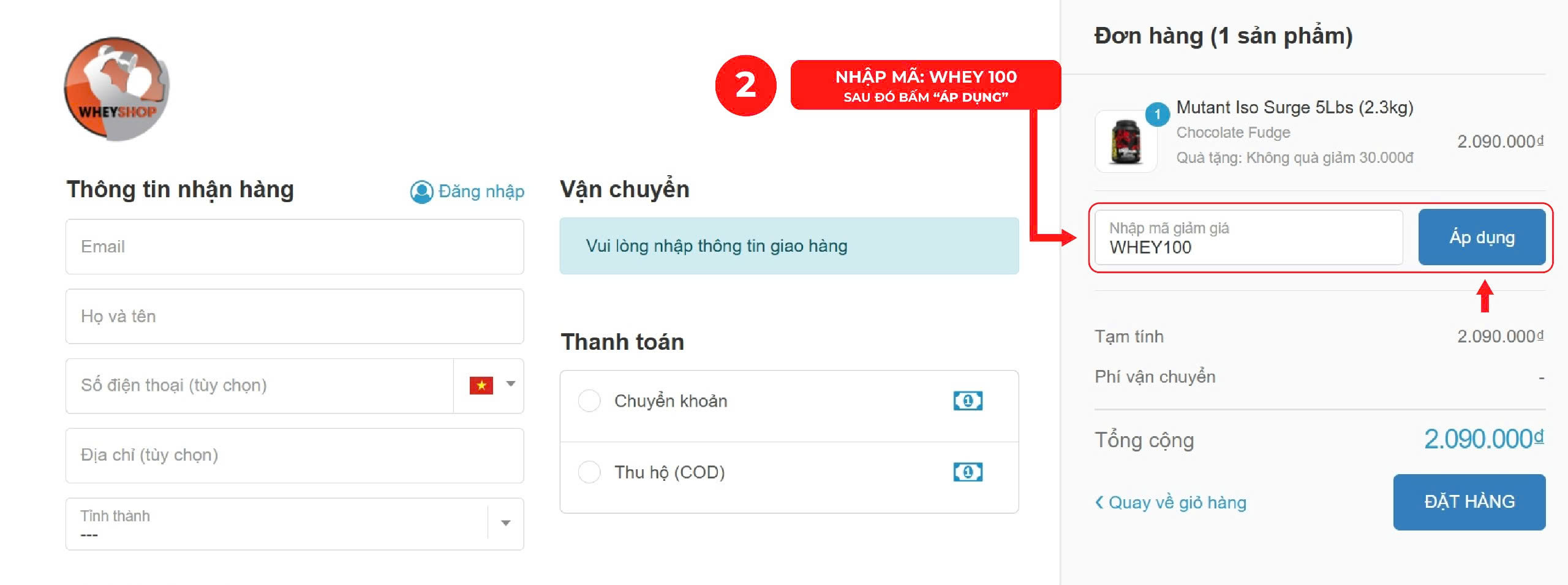 Trong trang thanh toán, tại phần “Mã giảm giá”, bạn hãy nhập mã: WHEY100