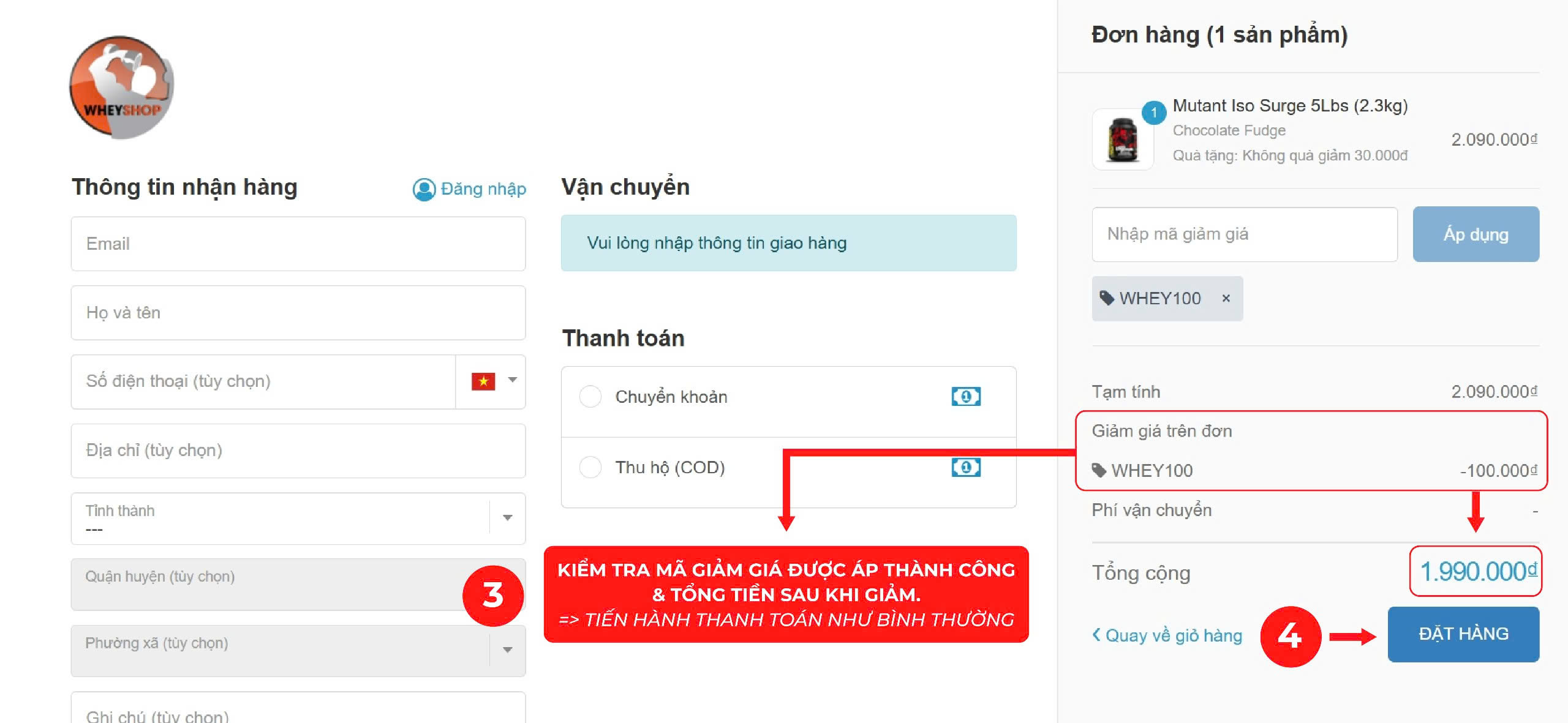 3. Hướng dẫn sử dụng mã giảm giá WHEY100 tại website Wheyshop.vn