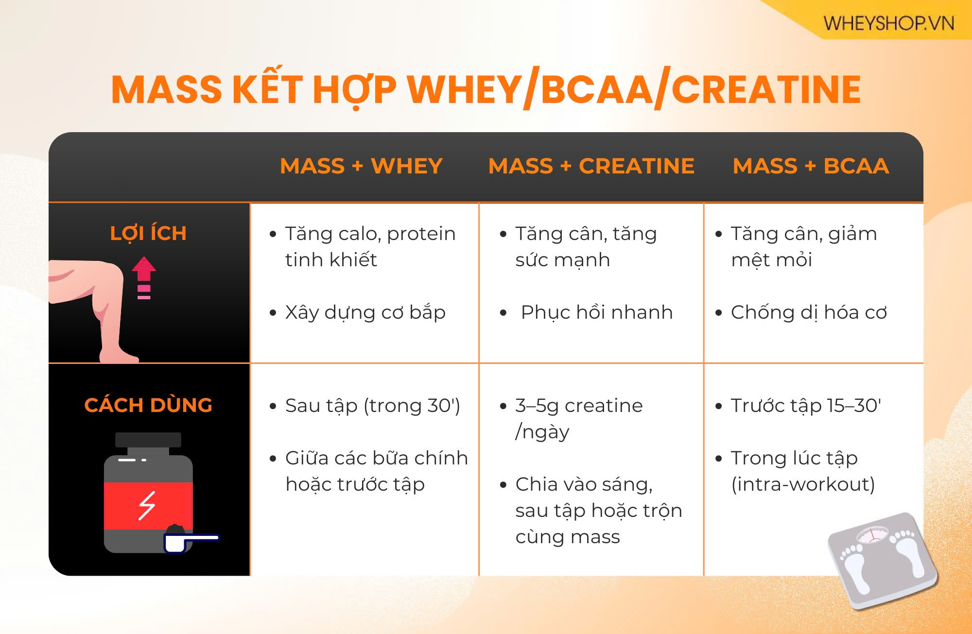 Combo mass + creatine là “bộ đôi vàng” cho gymer muốn tăng cân, tăng sức mạnh và phục hồi nhanh. Nhiều HLV thể hình còn khuyên rằng: nếu chỉ được chọn một sản phẩm đi kèm mass, hãy chọn creatine trước cả whey.