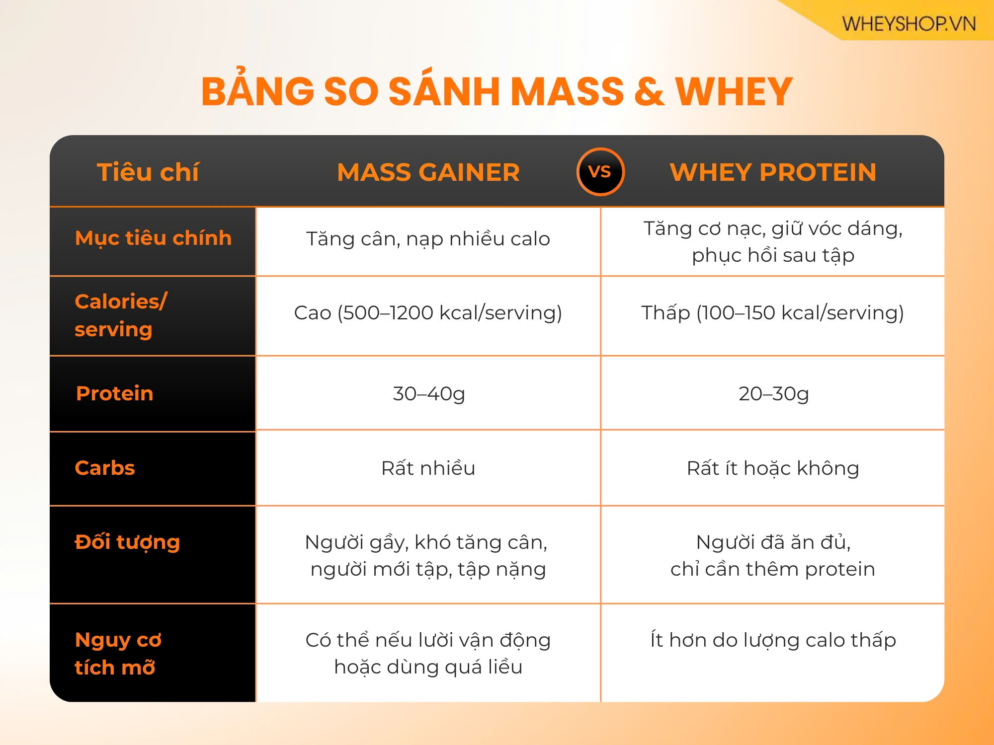 | Tiêu chí | Mass Gainer | Whey Protein |