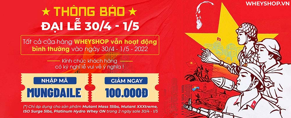 Nhân dịp mừng đại lễ 30/4 – 1/5, WheyShop dành tặng 100 mã giảm giá: MUNGDAILE