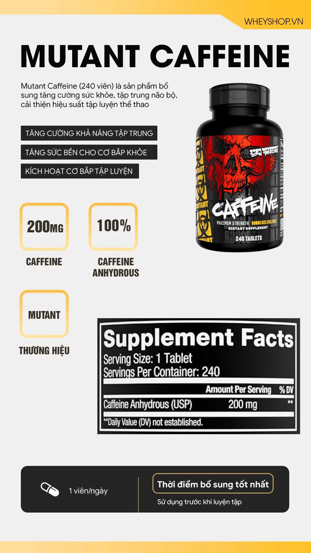 Mutant Caffeine là sản phẩm tập trung tăng cường sức mạnh, tỉnh táo tinh thần, đồng thời tăng hiệu suất tập luyện thể thao với hàm lương 200mg caffeine mỗi viên nén. Công thức Caffeine Mutant với mục tiêu tập trung não bộ, nâng cao ý chí tập luyện giúp bạn nhanh chóng đạt được thành tích mong muốn của bản thân, cải thiện hiệu quả tập luyện. Pre-workout Mutant Caffeine được Mutant sản xuất - thương hiệu dẫn đầu Canada và Quốc tế nghiên cứu thực phẩm bổ sung. Thành phần sản phẩm đảm bảo 100% Caffeine Anhydrous an toàn và không gây hại tới sức khỏe người dùng. Sản phẩm phù hợp với những ai cần bùng nổ năng lượng trước buổi tập, đặc biệt là gymer hay vận động viên phải tập vào khung giờ sáng sớm, chiều muộn hoặc những ngày cảm thấy uể oải, thiếu động lực. Với liều lượng chuẩn 200mg – tương đương 2 ly cà phê mạnh – Mutant Caffeine giúp tăng tỉnh táo, cải thiện phản xạ và kéo dài sự tập trung xuyên suốt buổi tập. Ngoài ra, dạng viên nén nhỏ gọn, dễ mang theo của Mutant Caffeine cực kỳ tiện lợi, không cần pha chế như các loại pre-workout truyền thống. Chỉ cần 1 viên trước buổi tập 15–30 phút, bạn đã sẵn sàng để “gồng tạ lên thiên đàng” với hiệu suất tối đa mà không lo crash năng lượng sau đó.
